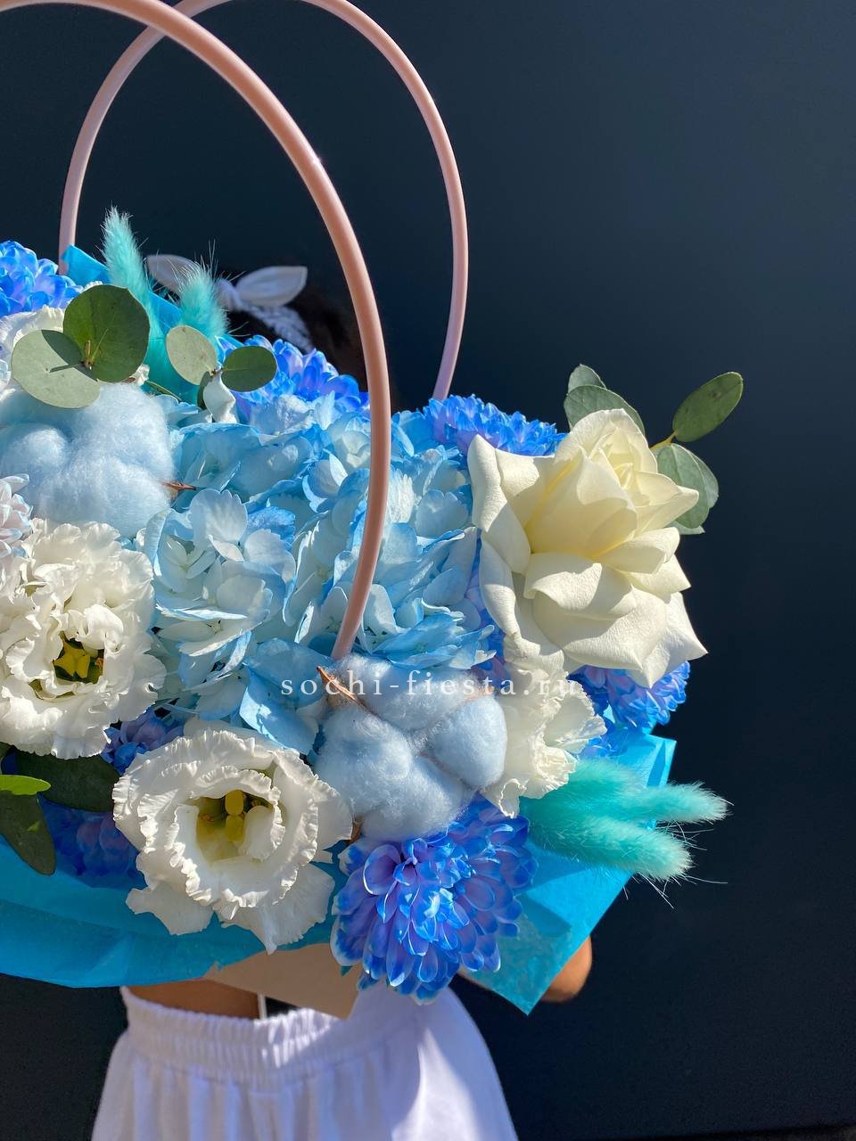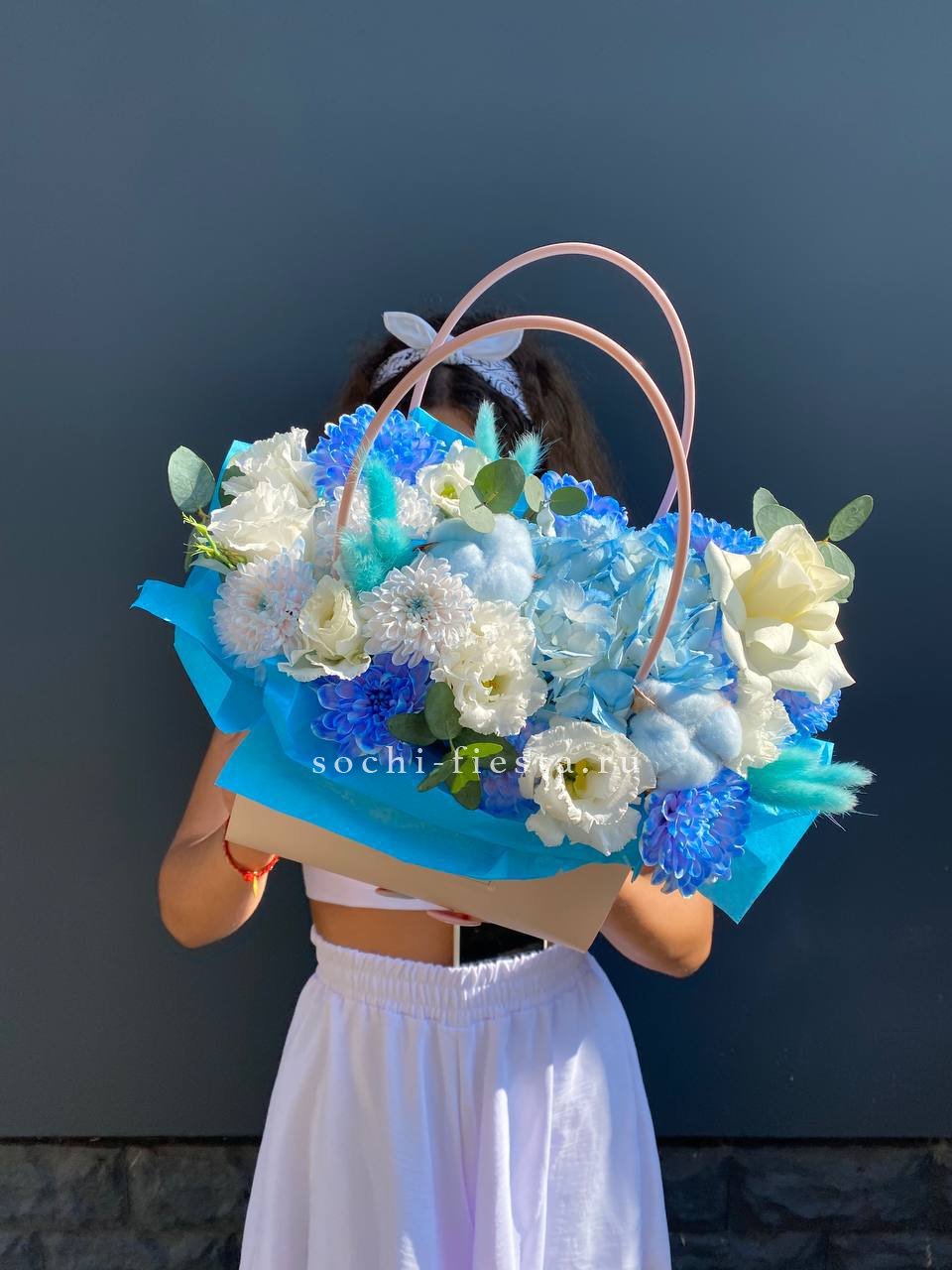 Миниатюрная композиция в удобной сумочке сочетает пышные головки хризантем с бархатистыми розами и воздушным диантусом. Веточки эвкалипта добавляют свежести, а компактная форма позволяет разместить цветы на рабочем столе или прикроватной тумбе.