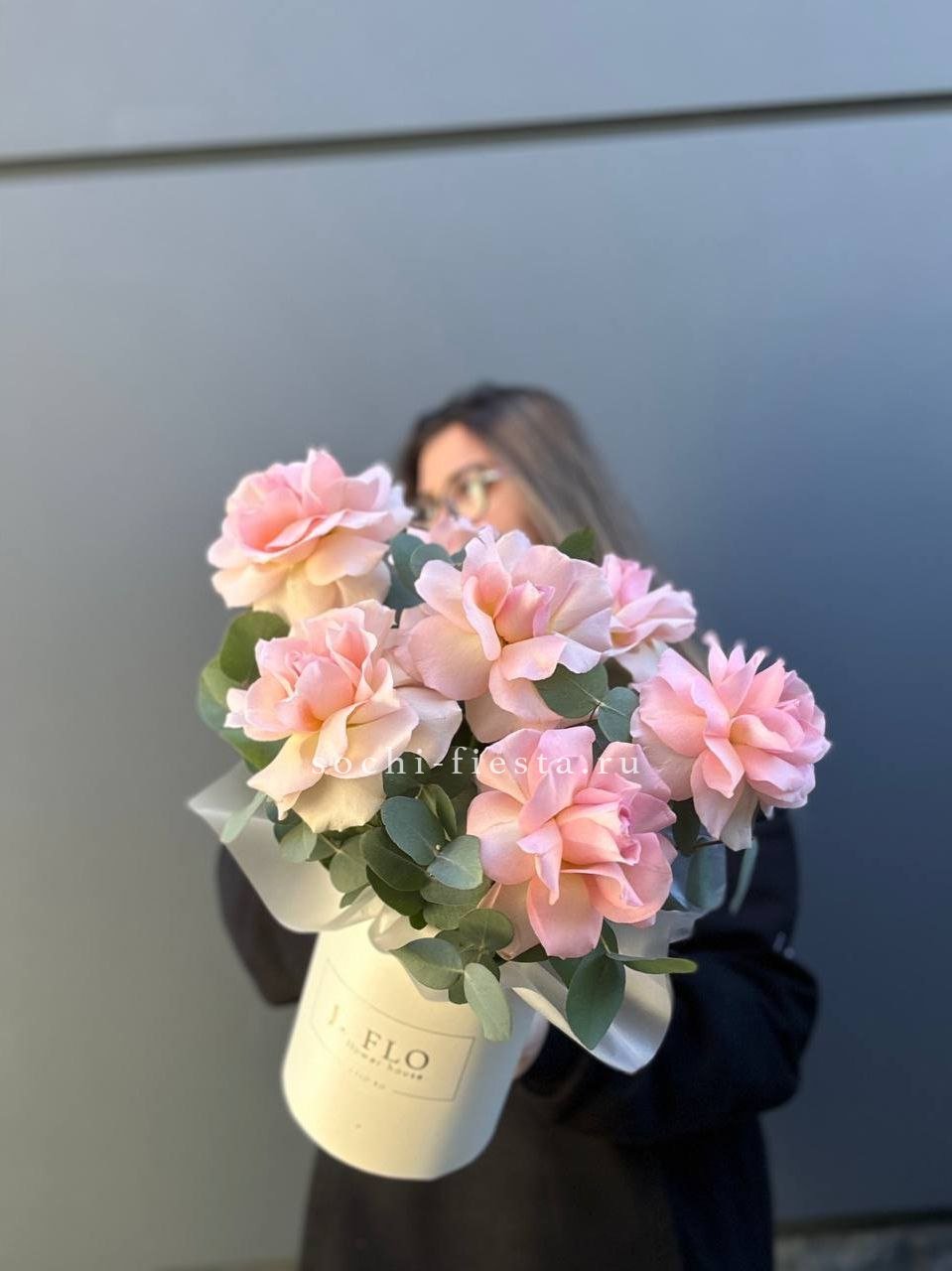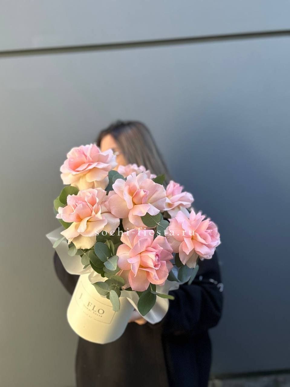 Семь роз Джумилия собраны в плотный силуэт с чёткими линиями. Дизайнерская упаковка усиливает графичность композиции и добавляет завершённость формы.