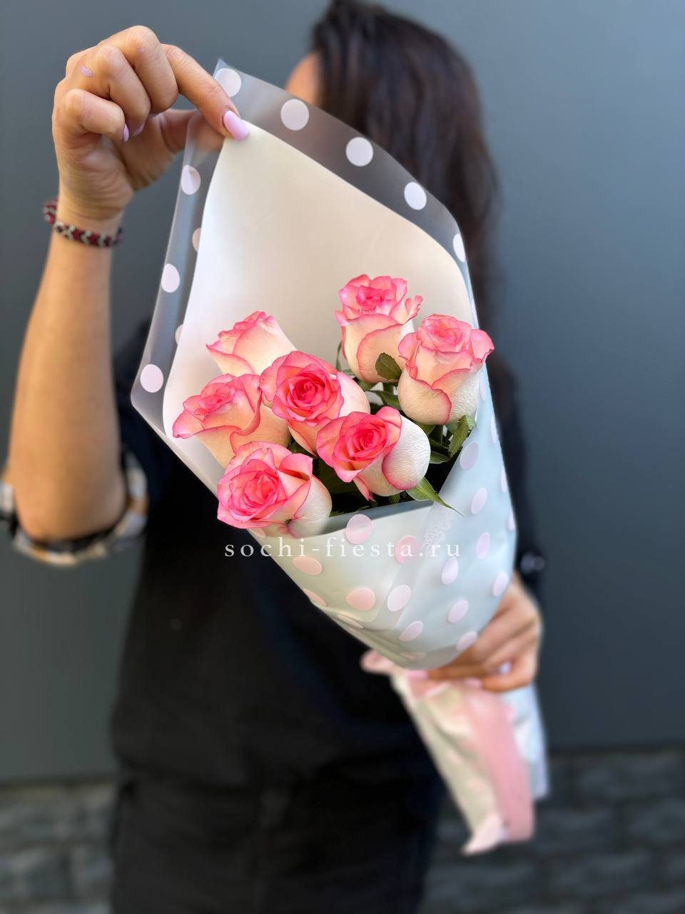 7 роз сорта Джумилия, лента, дизайнерская упаковка. Данная цена доступна при единовременном заказе от 10 шт.