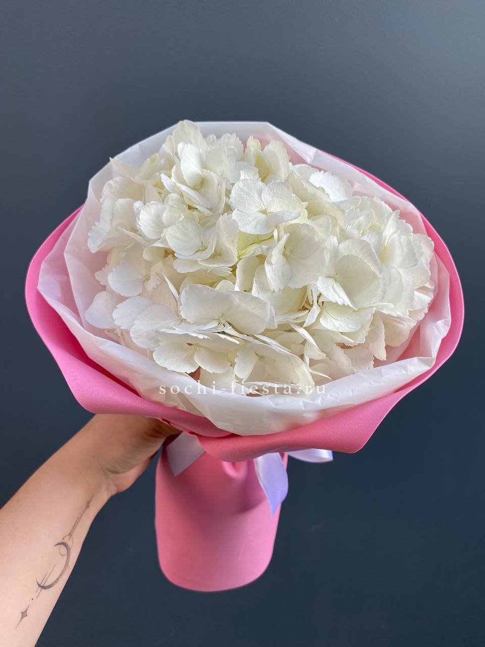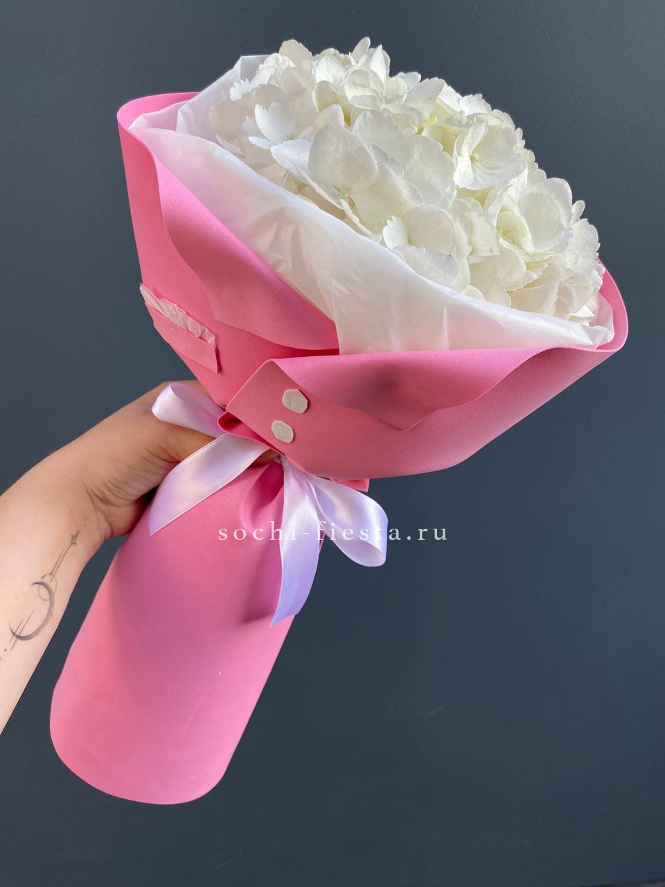 Пышная гортензия задает объем, эустома и диантус заполняют пространство между крупными бутонами. Статица добавляет графичность, а розы бомбастик завершают композицию.