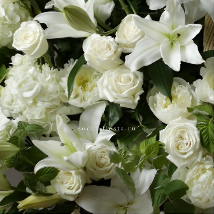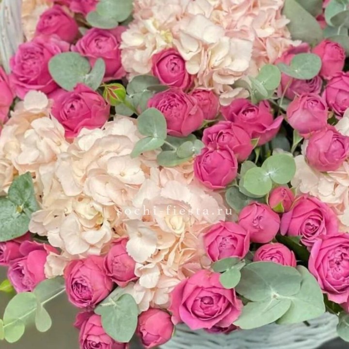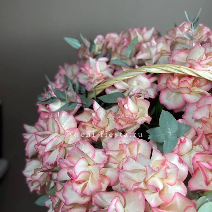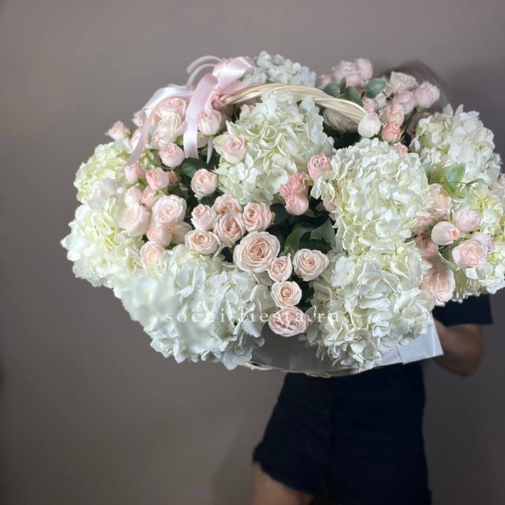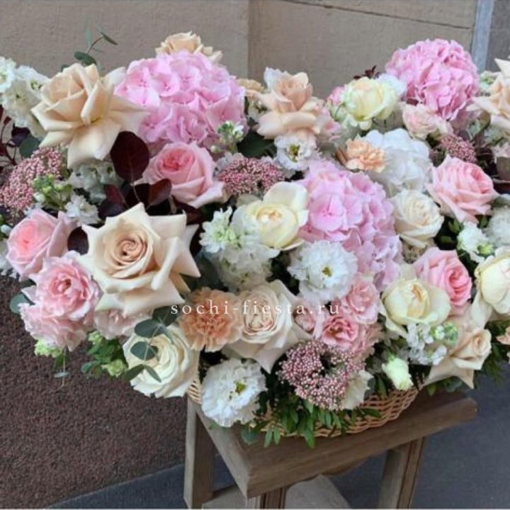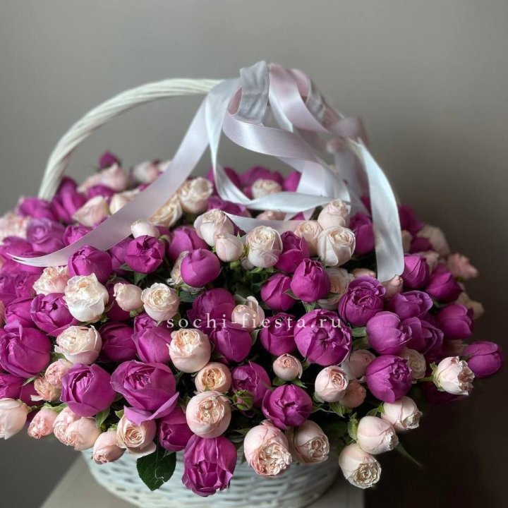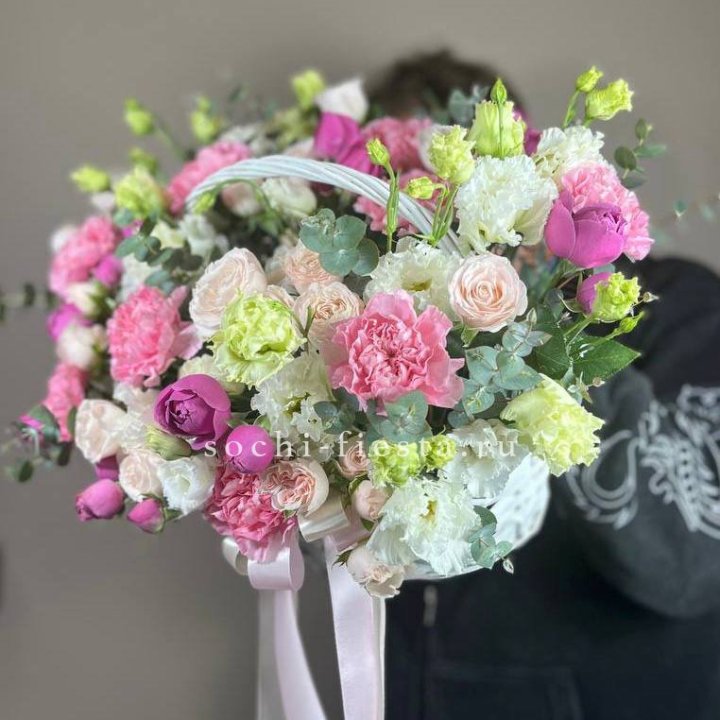 Состав корзин в Смоленске определяется текущими поставками и сезоном. Розы Freedom, Mondial, Cappuccino — для классических куполообразных аранжировок. Пионы в мае-июне из свежих поставок: Sarah Bernhardt, Red Charm, Bowl of Cream — главный сезонный продукт. Хризантема, альстромерия, гербера — для объёмных торжественных наполнений. Эустома, ранункули — для садовых корзин. Флорист строит состав под конкретный запрос.