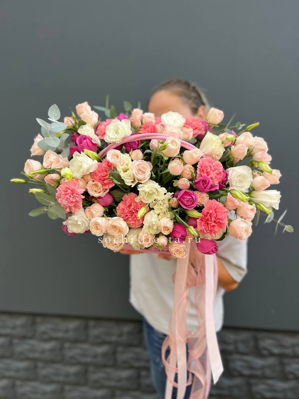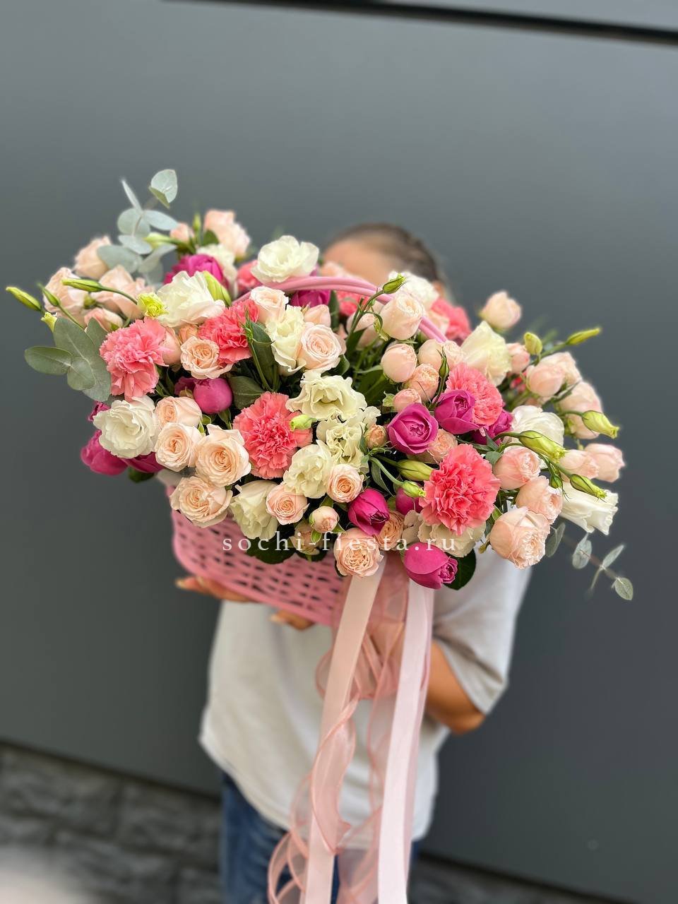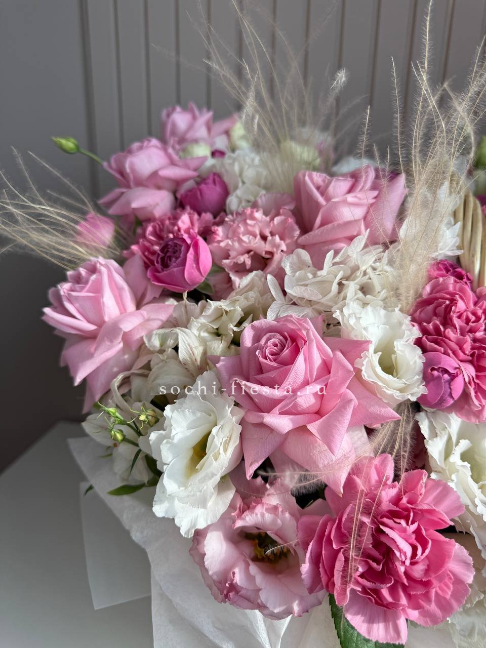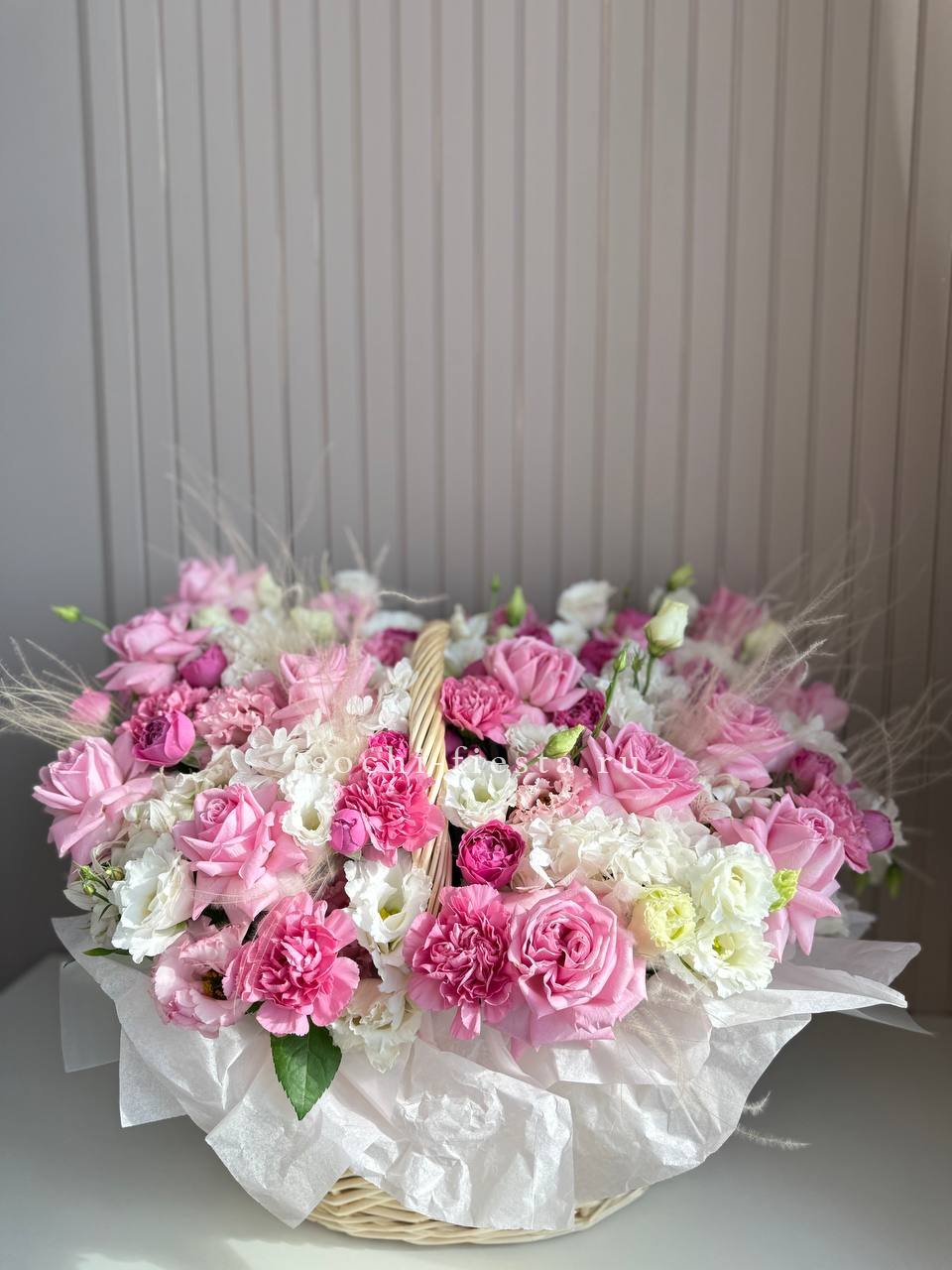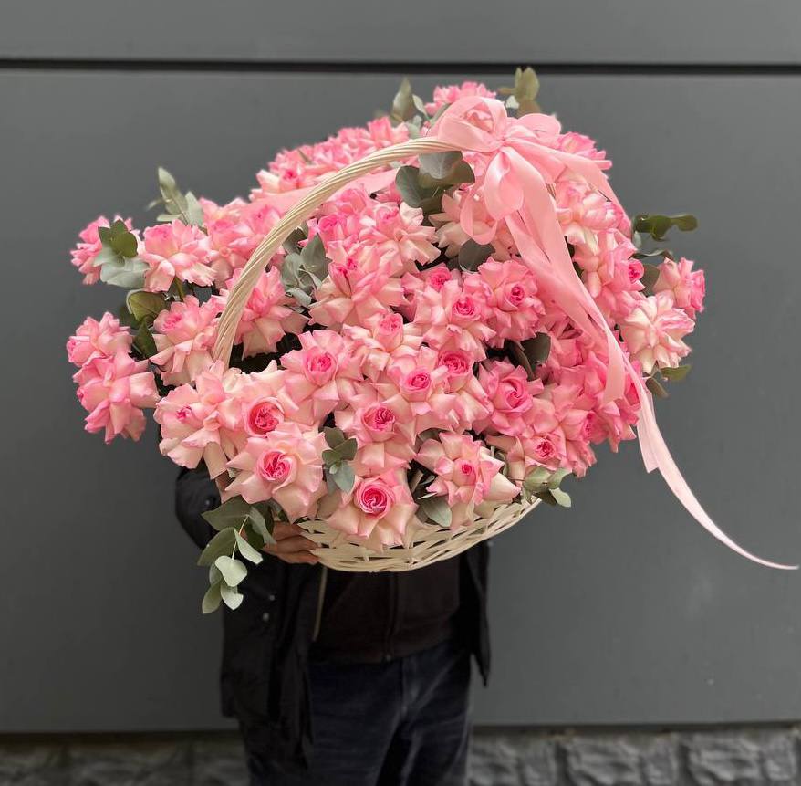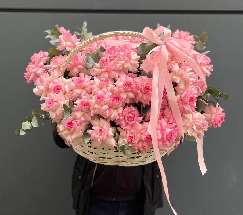 Восемь видов цветов складываются в harmonичную композицию со светлой корзиной в основе. Диантусы и эустома перекликаются с розами, а гортензия задает мягкий объем всей структуре.