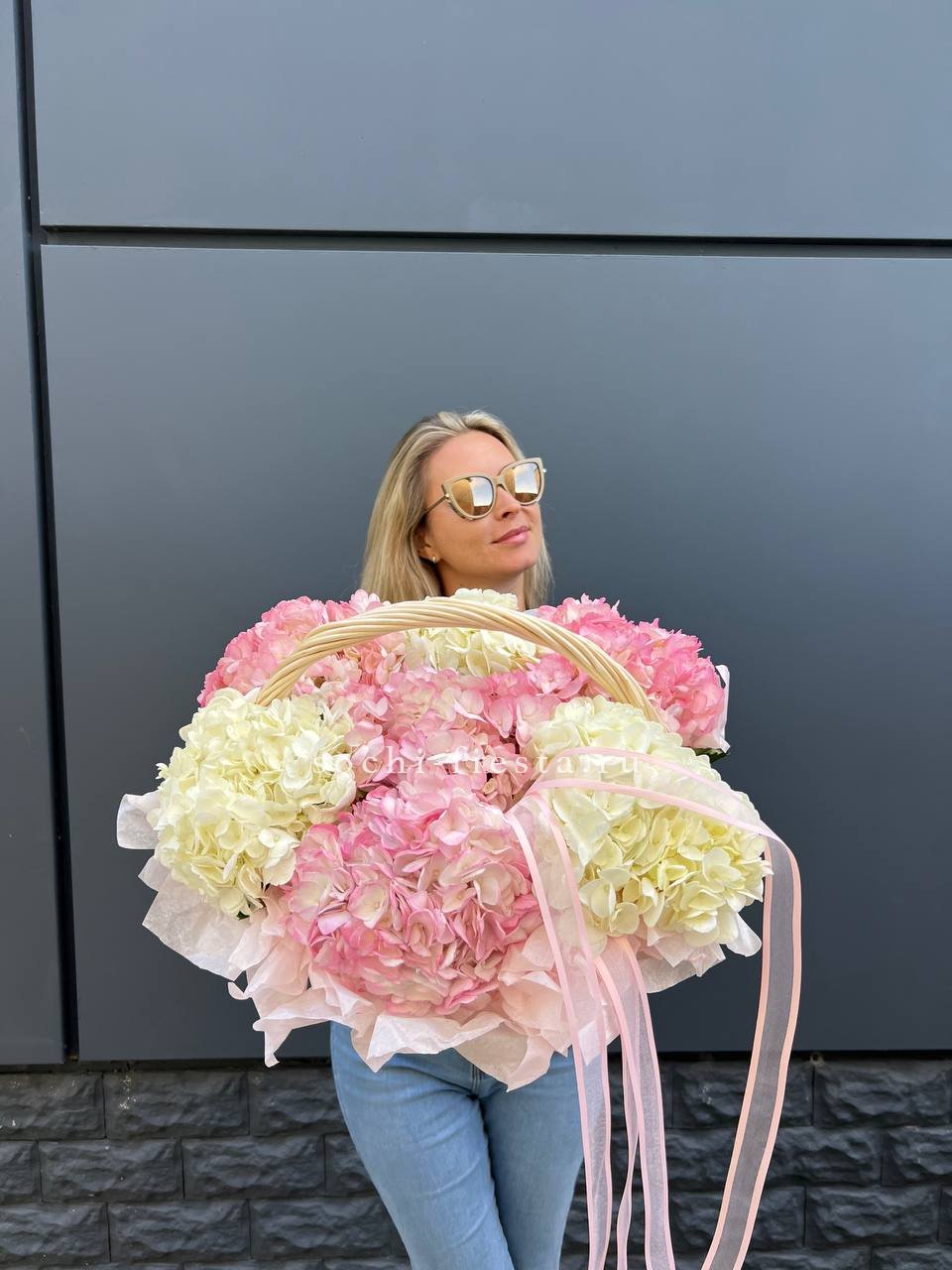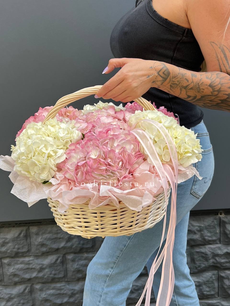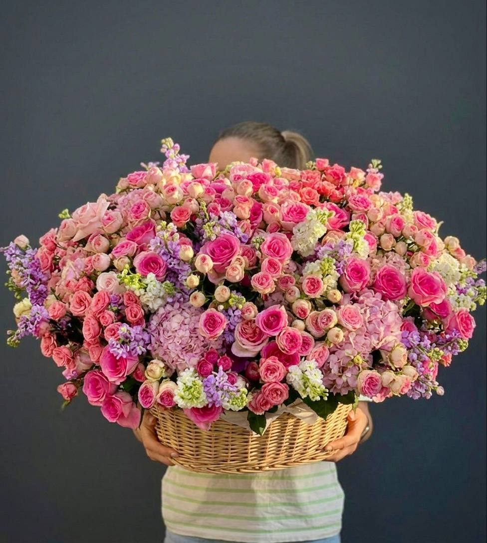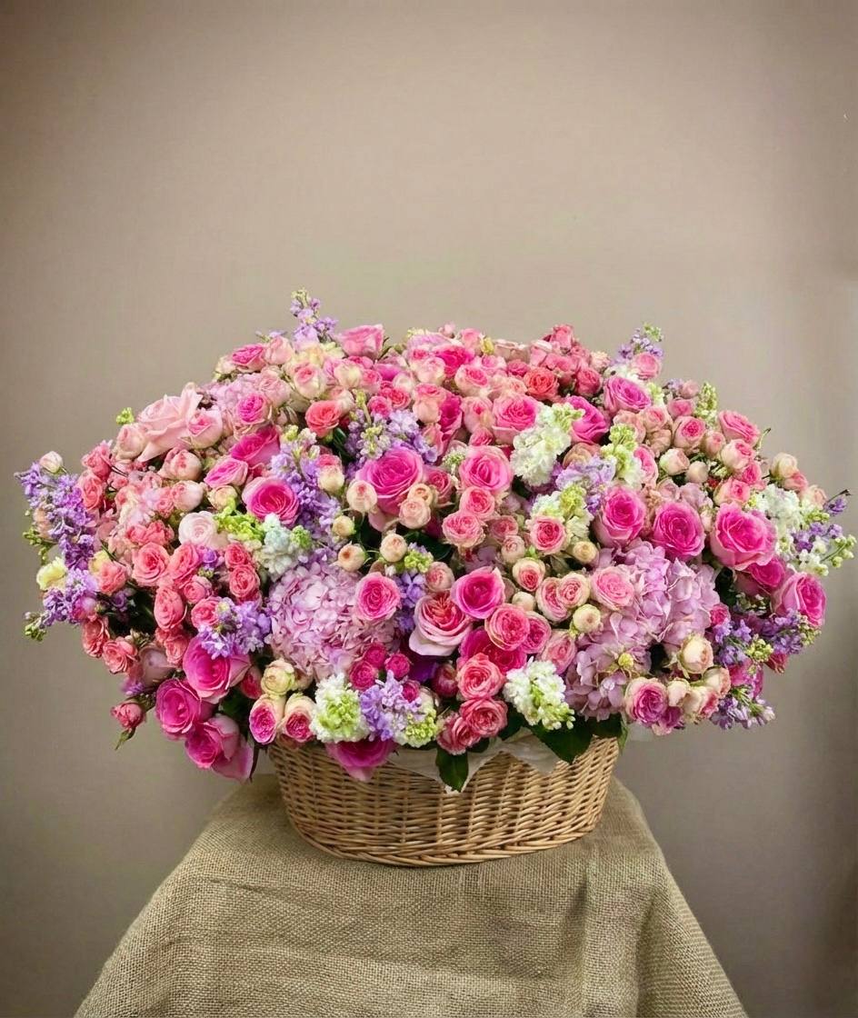 Корзина объединяет гортензии, эустомы, розы и маттиолу в многослойную композицию. Разные фактуры лепестков создают визуальную глубину и насыщенность.