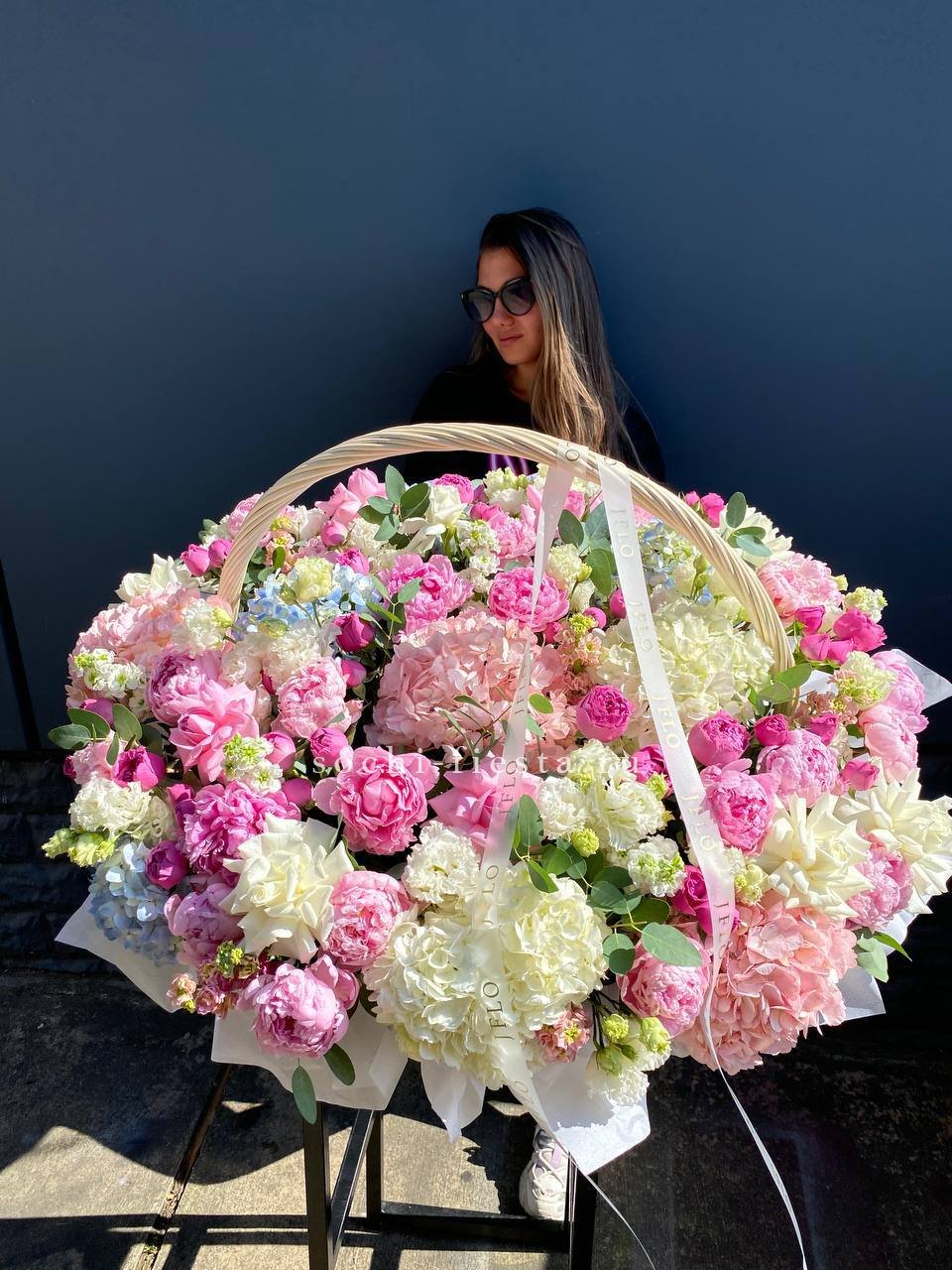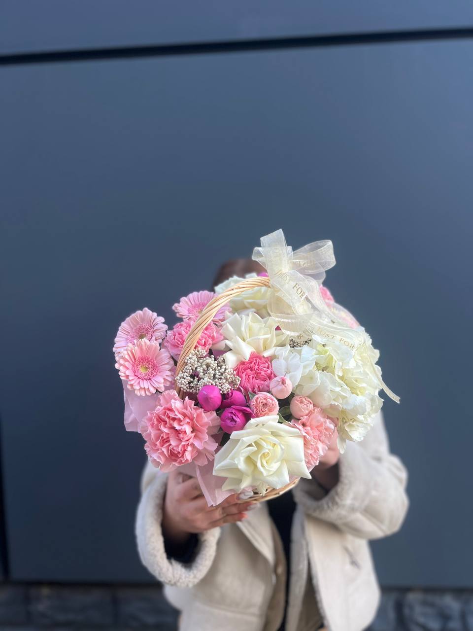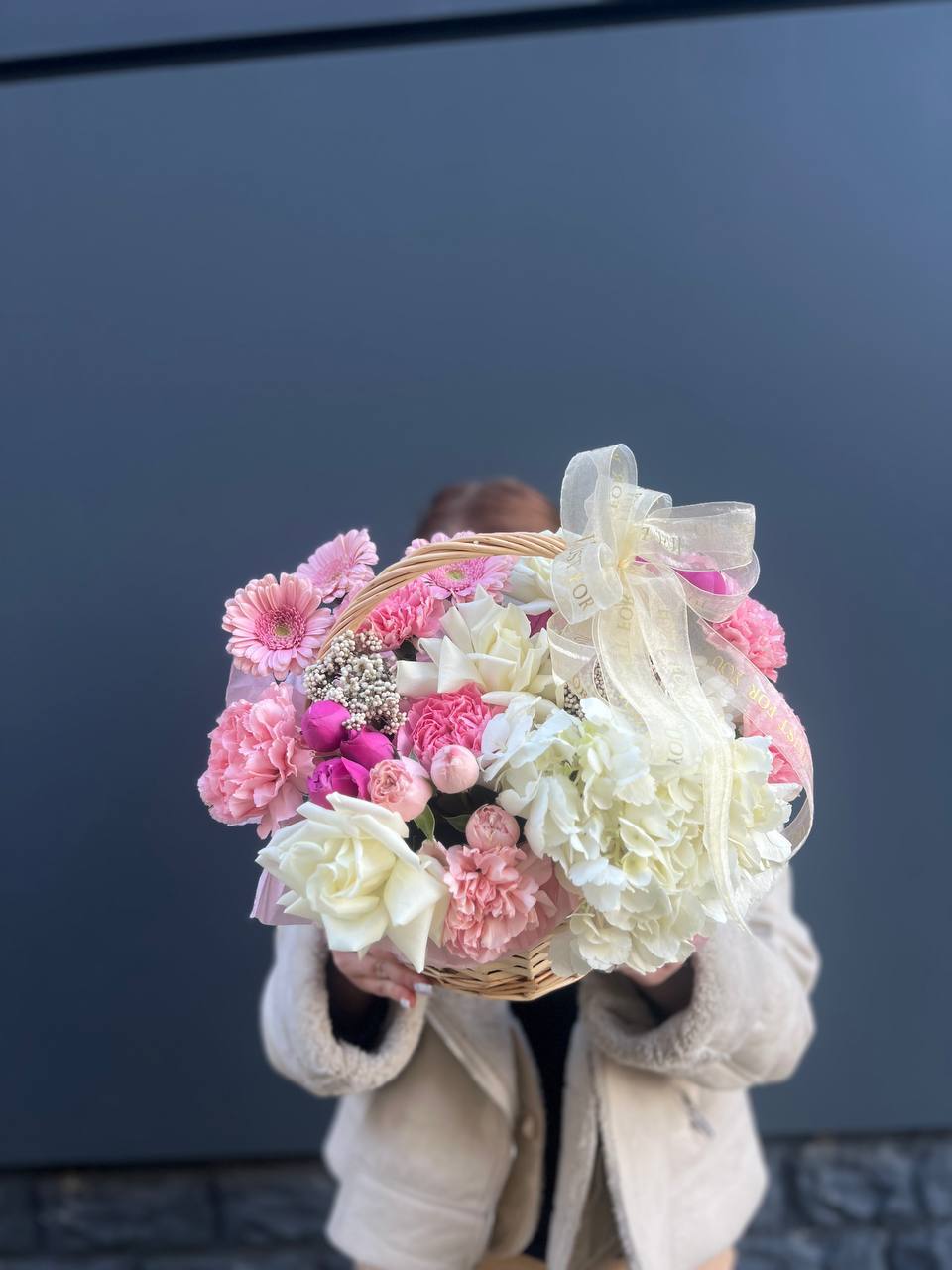 цветочная корзина с розами, мисти баблс, диантусами и гортензией.
