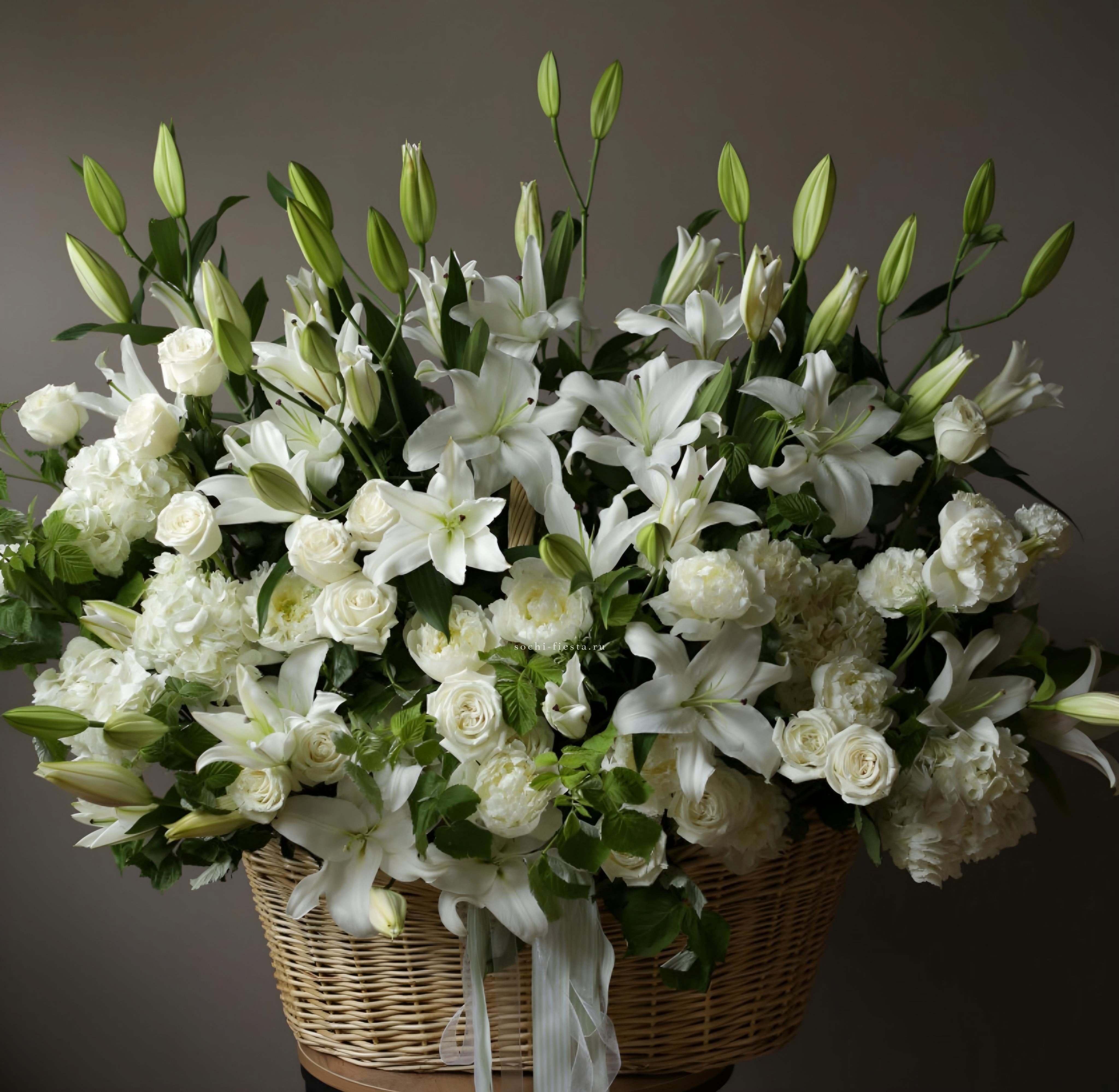 Пышная корзина с крупными бутонами роз, лилий и гортензий создаёт объёмную композицию с плавными переходами между соцветиями. Пионы добавляют воздушности и мягкости всей форме.
