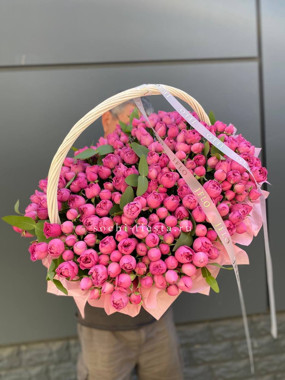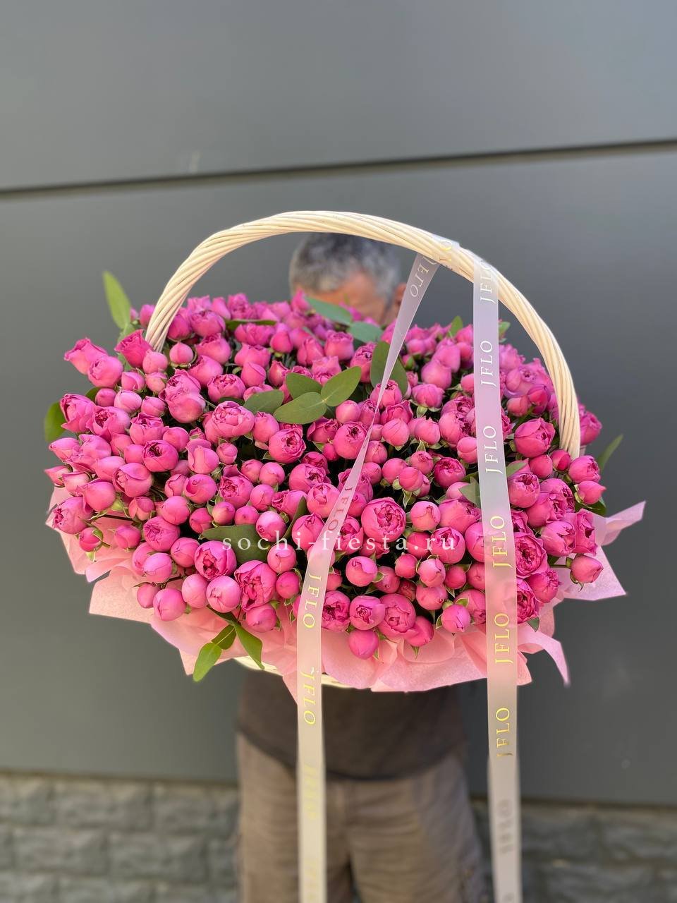 Шестьдесят одна голландская гербера собрана в плетёной корзине и создаёт яркое цветовое пятно высотой сорок сантиметров. Плотная россыпь соцветий держит форму и радует взгляд несколько дней подряд. Композиция не требует вазы и сразу готова к размещению в любом интерьере.
