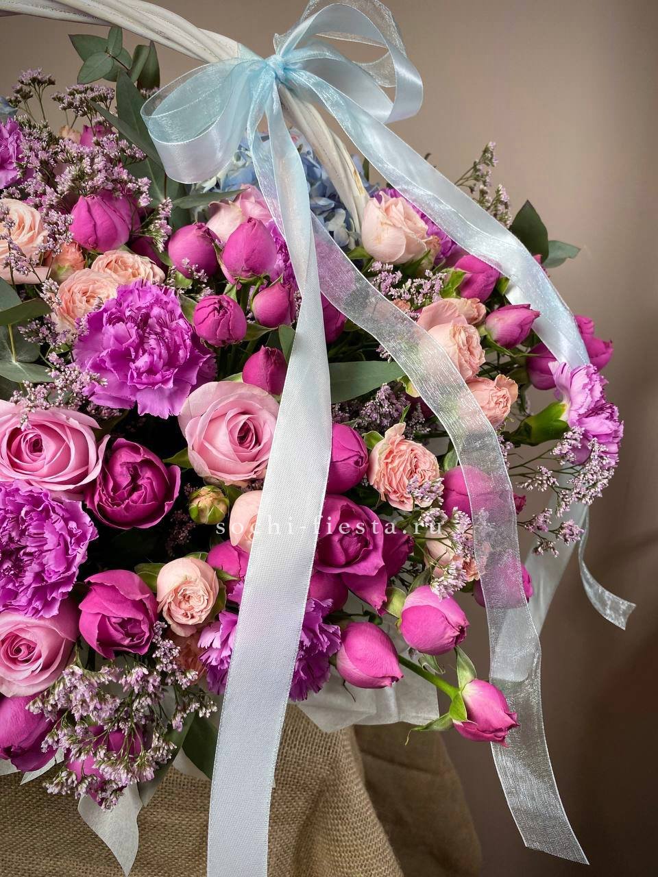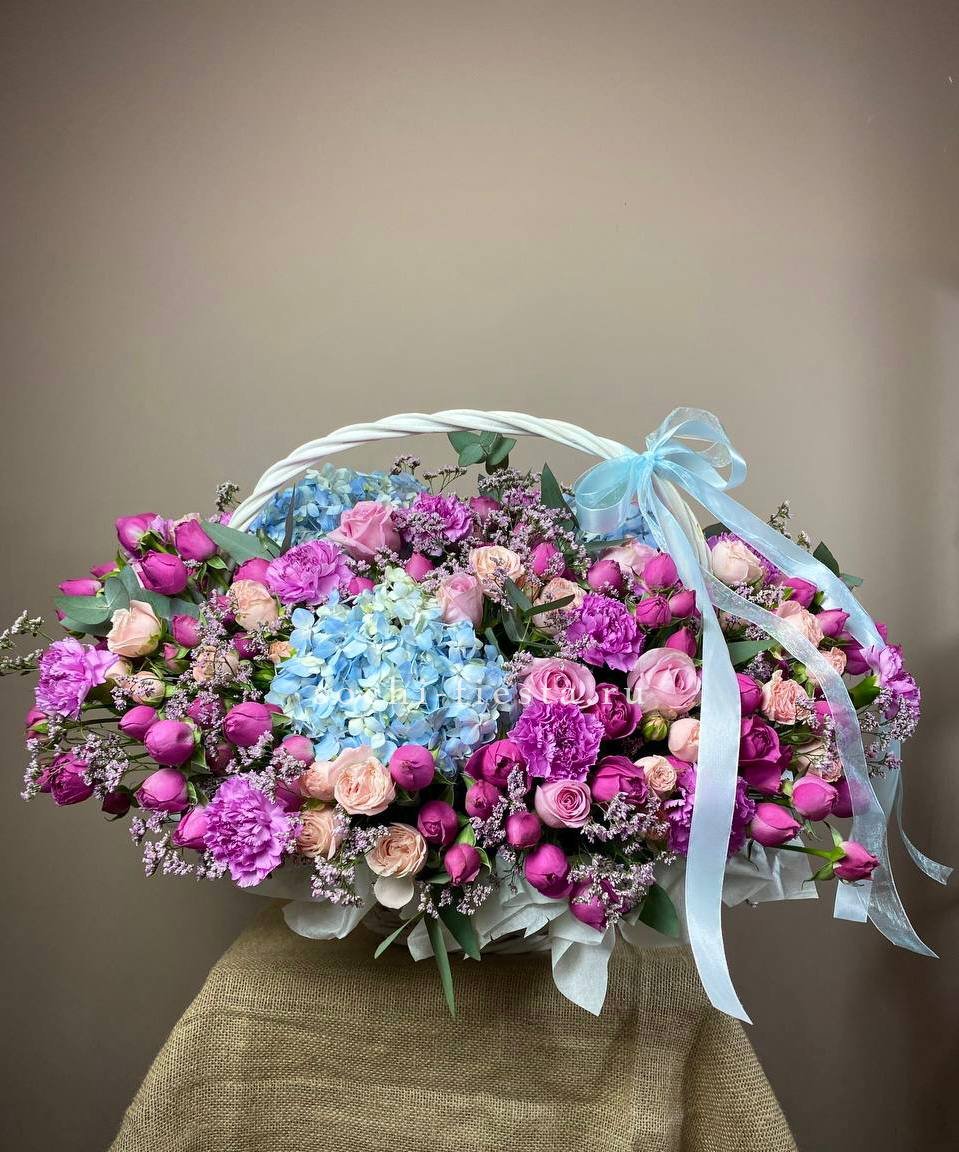 Плотная россыпь кустовых роз и эустомы создает живую текстуру с множеством мелких бутонов. Диантус добавляет воздушности, а эвкалипт собирает композицию в завершенную форму. Корзина позволяет разместить букет на столе без дополнительной вазы.