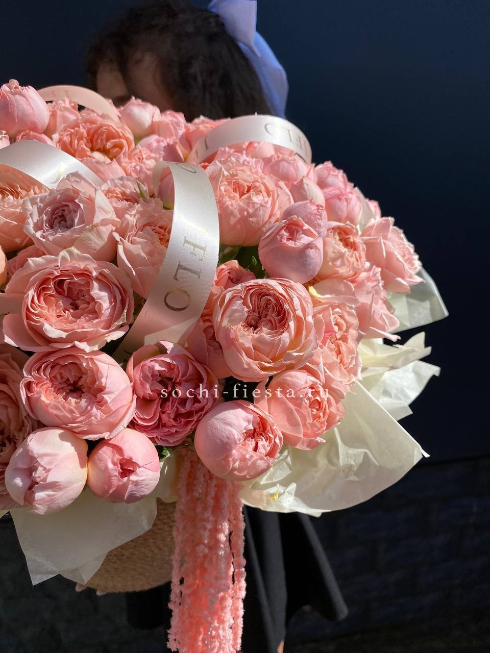 кустовые пионовидные розы сорта "Джульетта", джутовое кашпо, тишью, лента.