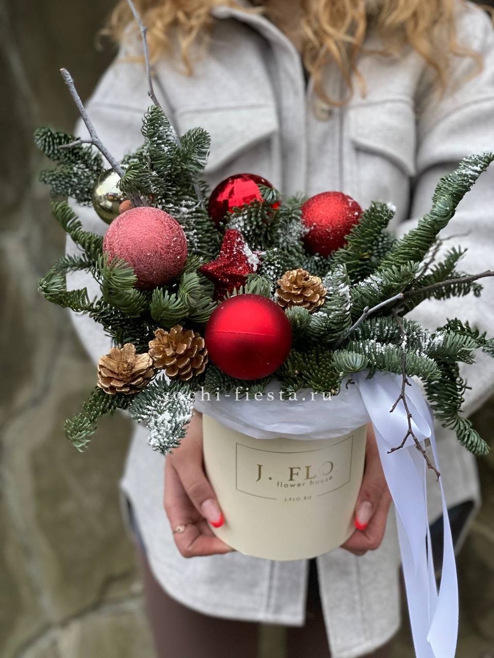 Датский нобилис в красной коробке собран плотно и графично. Шишки и праздничные игрушки создают объём и заполняют пространство между ветками. Композиция держит форму и выглядит завершённой.