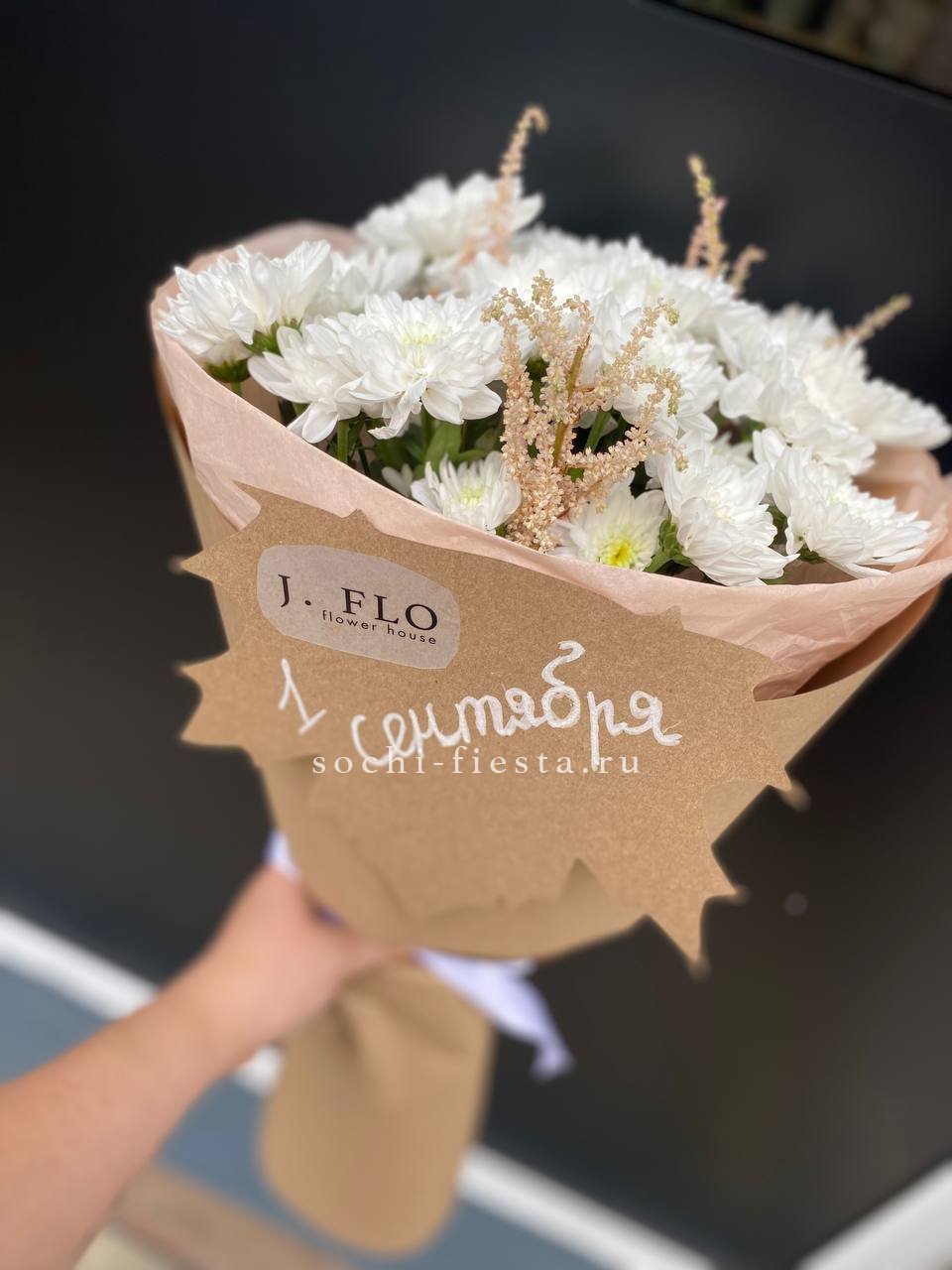 Белоснежные шапки хризантем и воздушные метелки астильбы собраны в композицию с четким вертикальным ритмом. Букет напоминает о первых школьных линейках и свежести сентябрьского утра.
