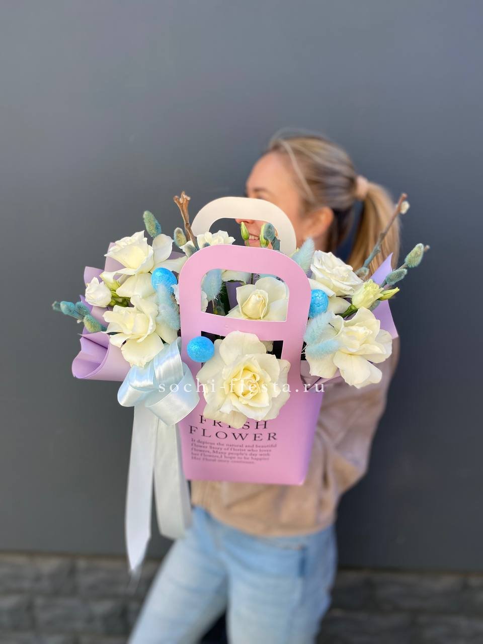 белые розы, верба, лагурус, эвкалипт, яица, сумочка.