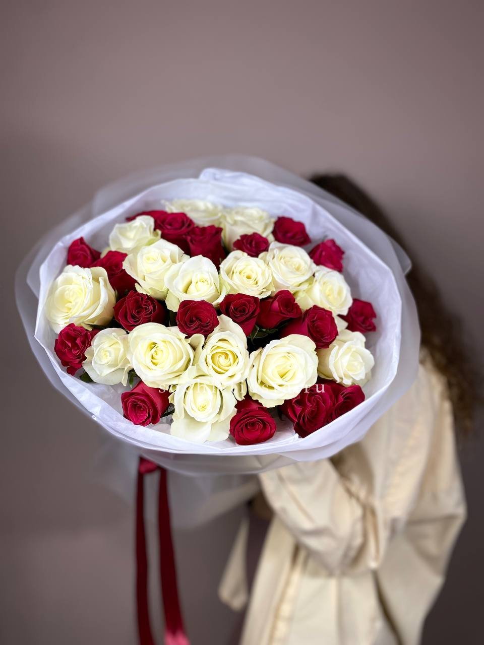 Красный и белый образуют чёткий графический рисунок в каждом повороте букета. 25 роз собраны плотно, создавая объёмную композицию с выразительной игрой оттенков.