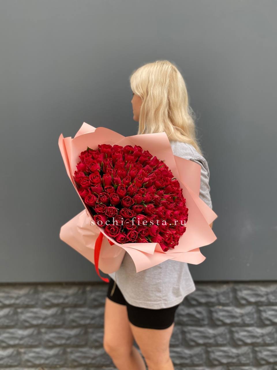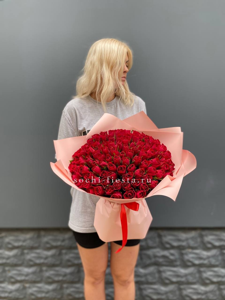 Сто одна белая роза собрана в впечатляющую охапку. Монохромная гамма и повторяющийся ритм бутонов создают мощное визуальное присутствие. Такой объём заполняет пространство и приковывает внимание.