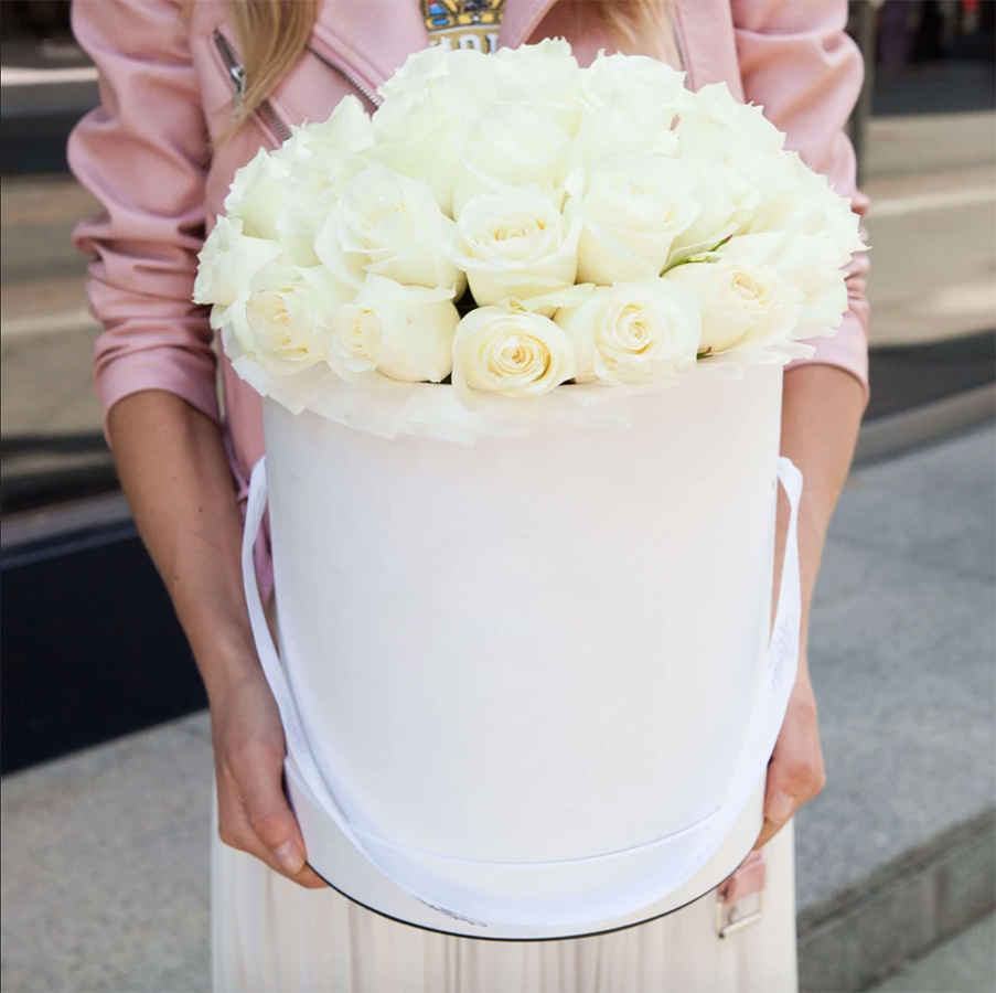 Пятнадцать белых роз собраны в аккуратную сумочку с веточками эвкалипта. Компактная форма позволяет разместить композицию на столе или полке, а матовая зелень добавляет свежести классическому белому цвету.