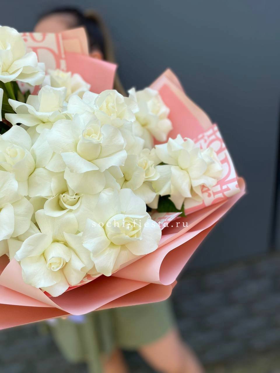 Пятнадцать белых роз собраны в плотный букет с чистыми линиями. Прозрачная упаковка сохраняет свежесть и открывает естественную красоту бутонов.