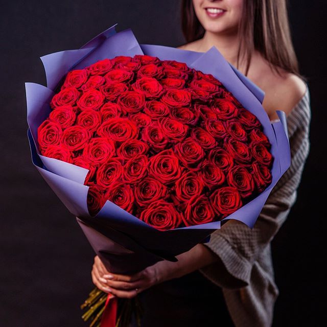 Красный монохром из пятидесяти одной розы притягивает взгляд своей насыщенностью. Крупная композиция заполняет пространство и создает яркое визуальное впечатление.