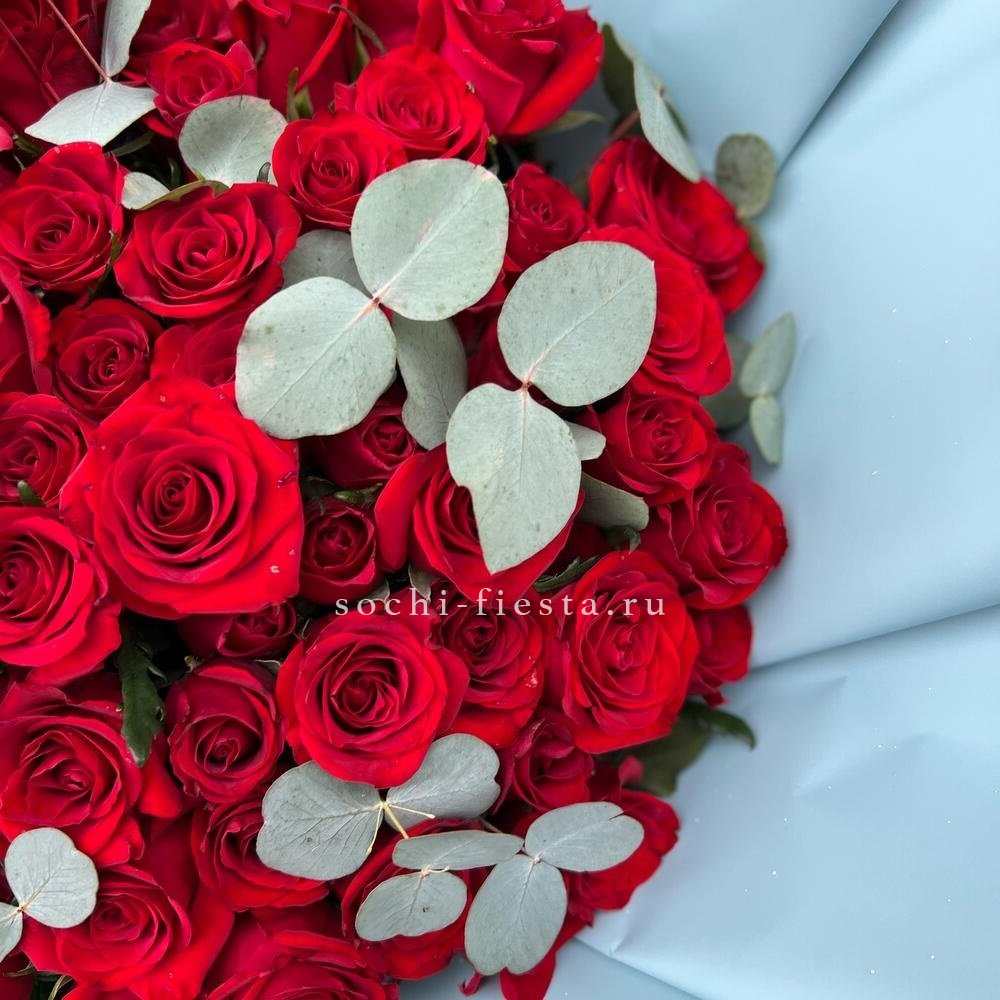 Красный оттенок лепестков переходит от алого к винному в глубине бутонов. Семь роз с эвкалиптом собраны плотно, создавая яркое цветовое пятно.