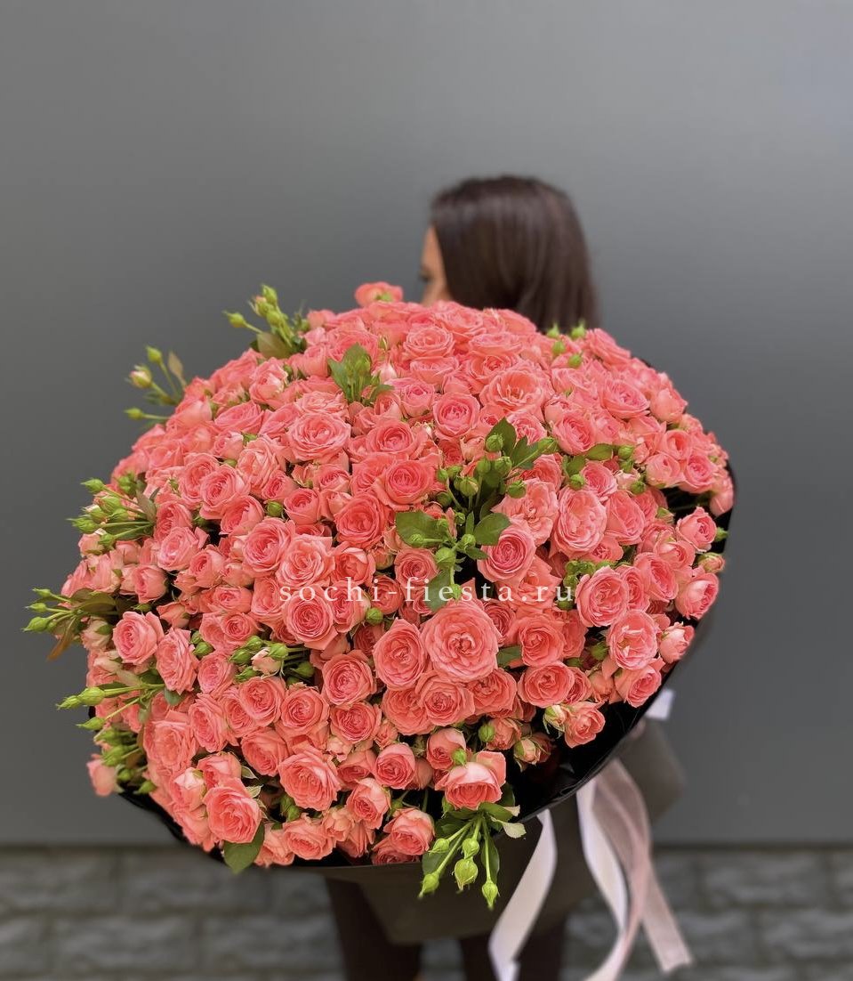 Сто одна кустовая роза Барбадос создаёт впечатляющий объём и визуальную мощь. Множество бутонов формируют плотную структуру с выразительным силуэтом. Композиция наполняет пространство и приковывает взгляд.