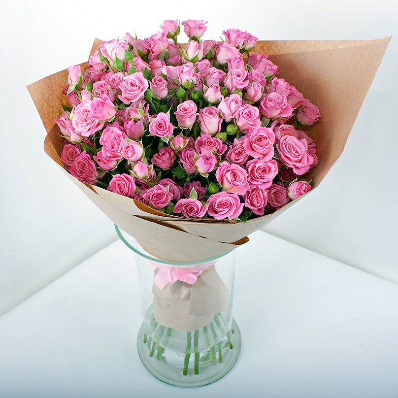 15 кустовых роз, лента, крафт.