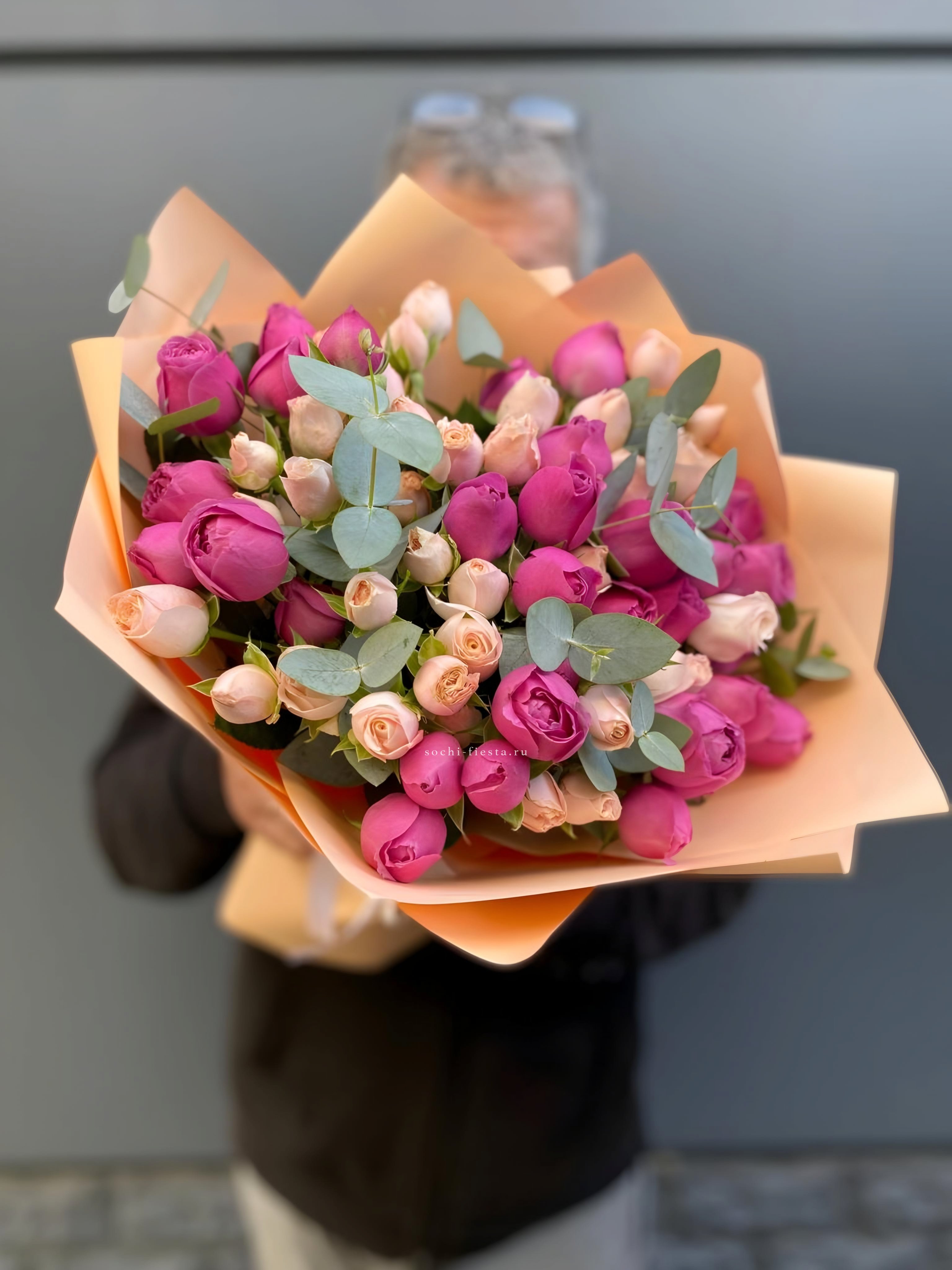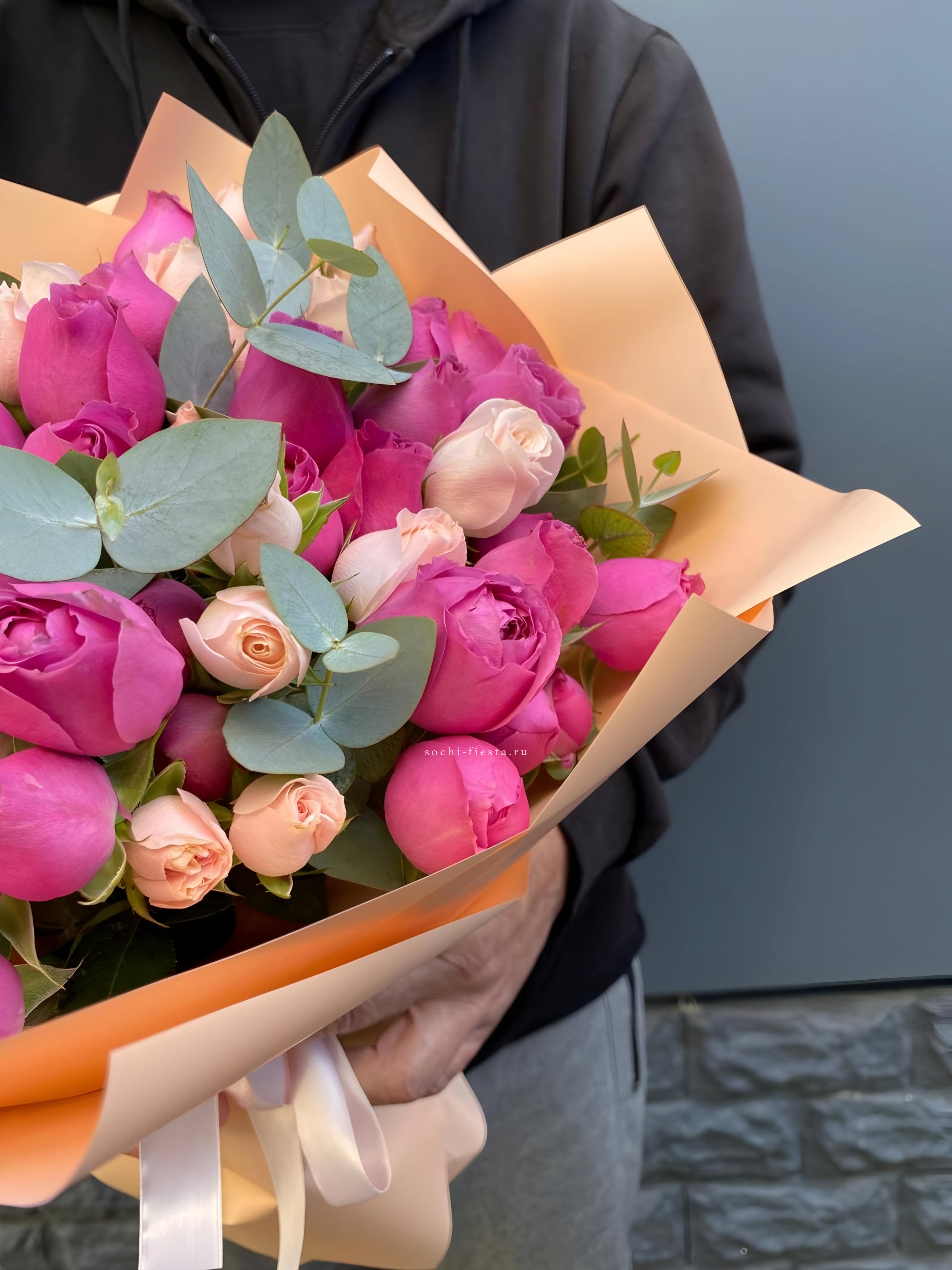 25 пионовидные кустовые розы,  хлопок, лента, дизайнерская упаковка.