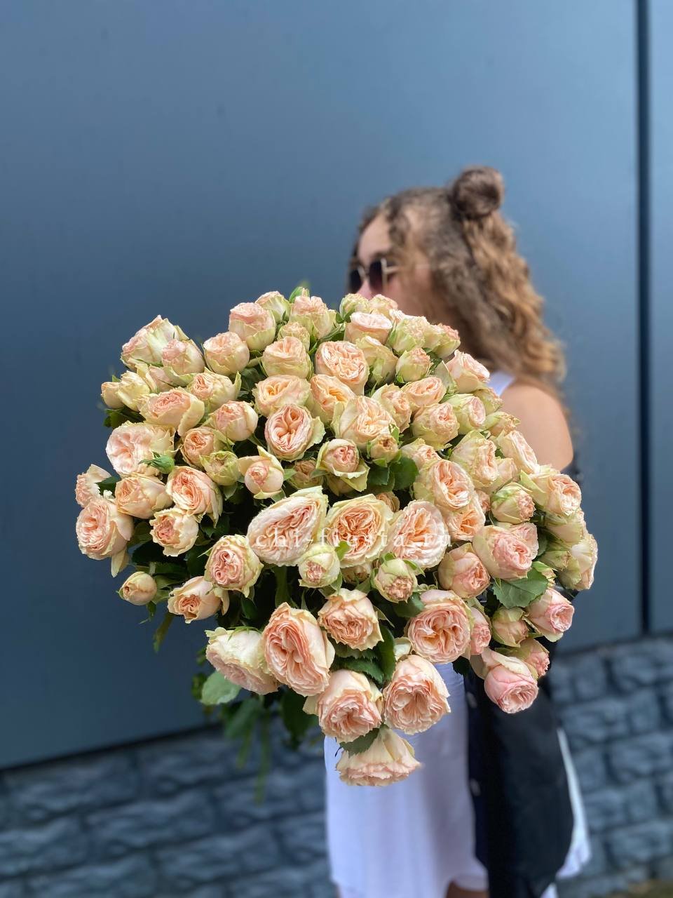 Двадцать пять пышных пионовидных роз собраны в плотный купол, где каждый бутон раскрывается слоями густых лепестков. Объёмная композиция заполняет пространство живой текстурой и создаёт ощущение abundance.