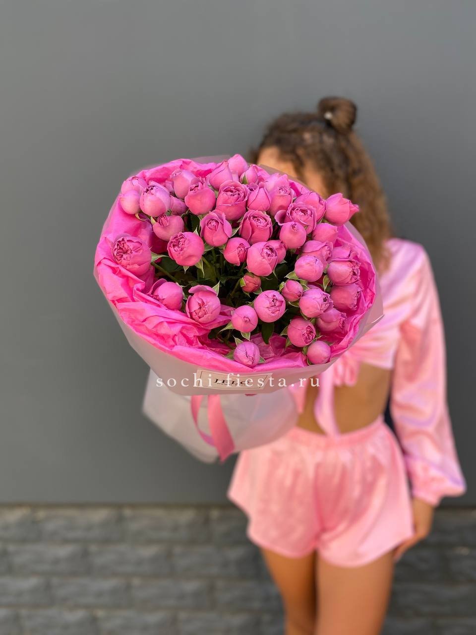розы пионовидные 21шт, эвкалипт, пленка, лента.