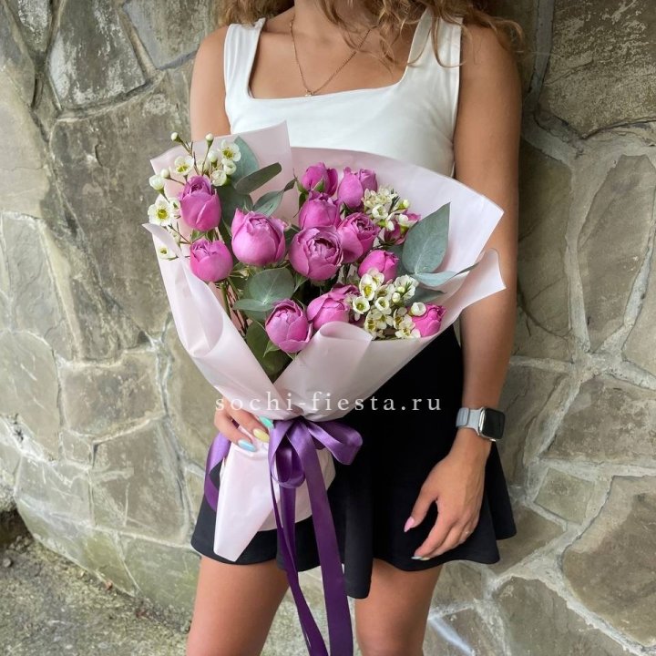 Основа сборных букетов в Смоленске: розы (Freedom, Mondial, Avalanche), хризантема кустовая, альстромерия, эустома, фрезия, вероника. Дополнительно — ранункулюсы в сезон, хризантема одиночная, ирис весной, тюльпаны в апреле. Состав зависит от текущей поставки и сезона. Флорист всегда предлагает то, что в лучшей форме прямо сейчас.