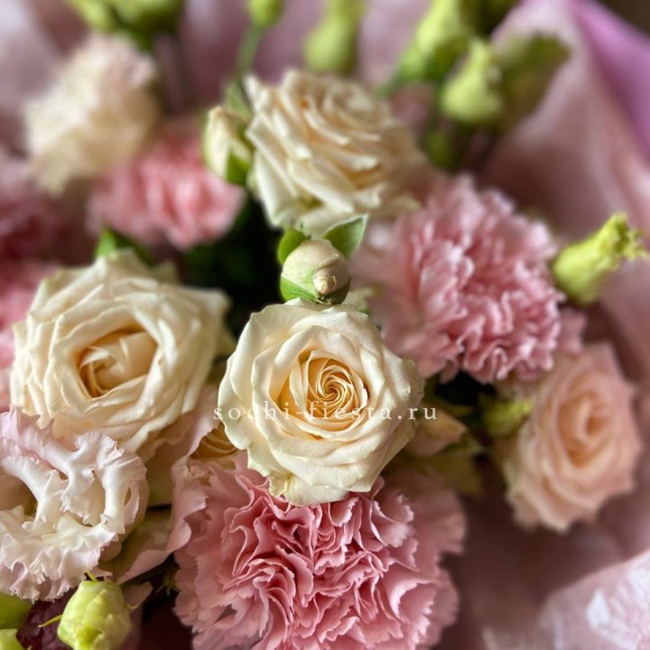 Основа сборных букетов в Смоленске: розы (Freedom, Mondial, Avalanche), хризантема кустовая, альстромерия, эустома, фрезия, вероника. Дополнительно — ранункулюсы в сезон, хризантема одиночная, ирис весной, тюльпаны в апреле. Состав зависит от текущей поставки и сезона. Флорист всегда предлагает то, что в лучшей форме прямо сейчас.