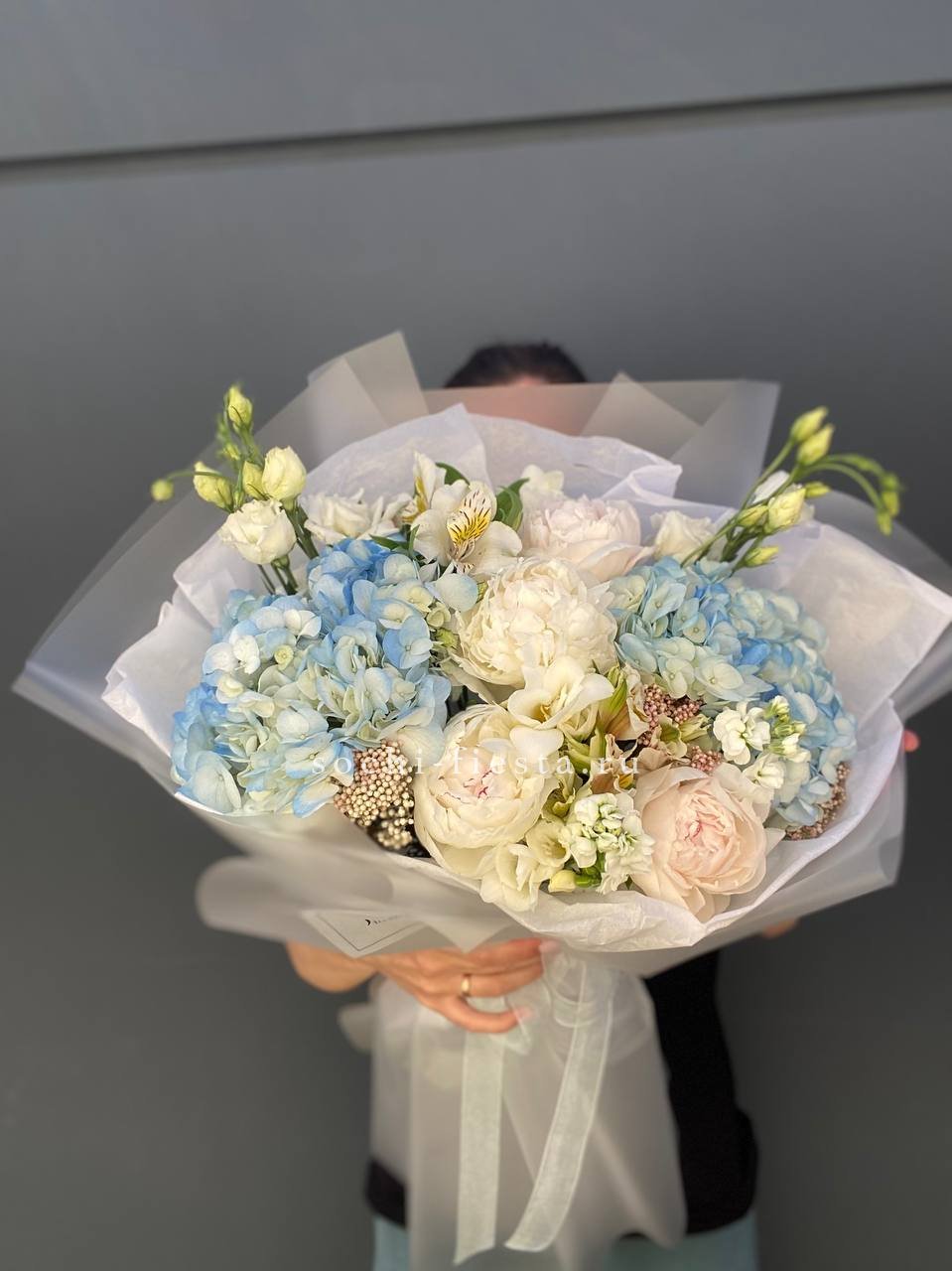 Светлая композиция собрана из пионов, гортензий и эустомы в мягкой белоснежной гамме. Воздушная форма с лёгкими переходами между соцветиями создаёт ощущение морозной свежести.