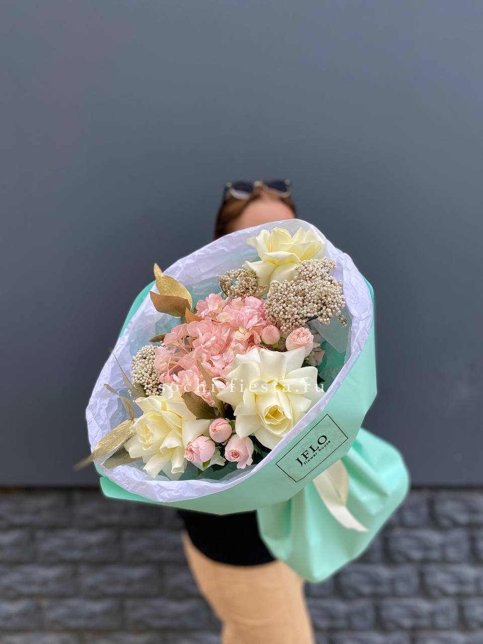 Белые розы и шары гортензии заполняют пространство плотно, но без тяжести. Озатамус вносит лёгкую текстуру, а эвкалипт завершает силуэт спокойной зеленью.