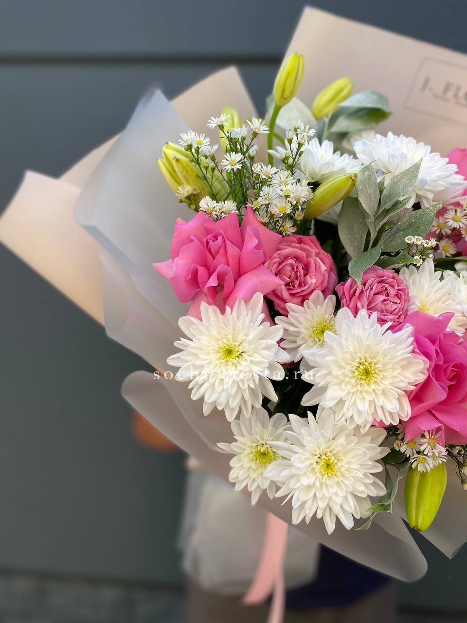 Сочетание лилий и роз разных форм с кустовыми хризантемами и ромашками создаёт многослойную композицию. Carlo объединяет садовую свежесть и классическую гармонию в одном букете.