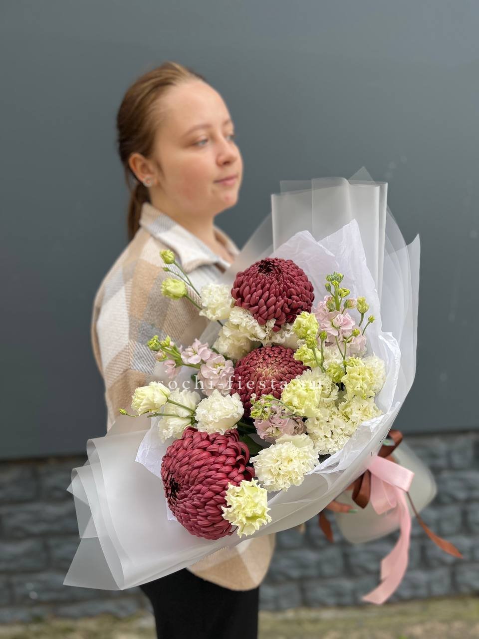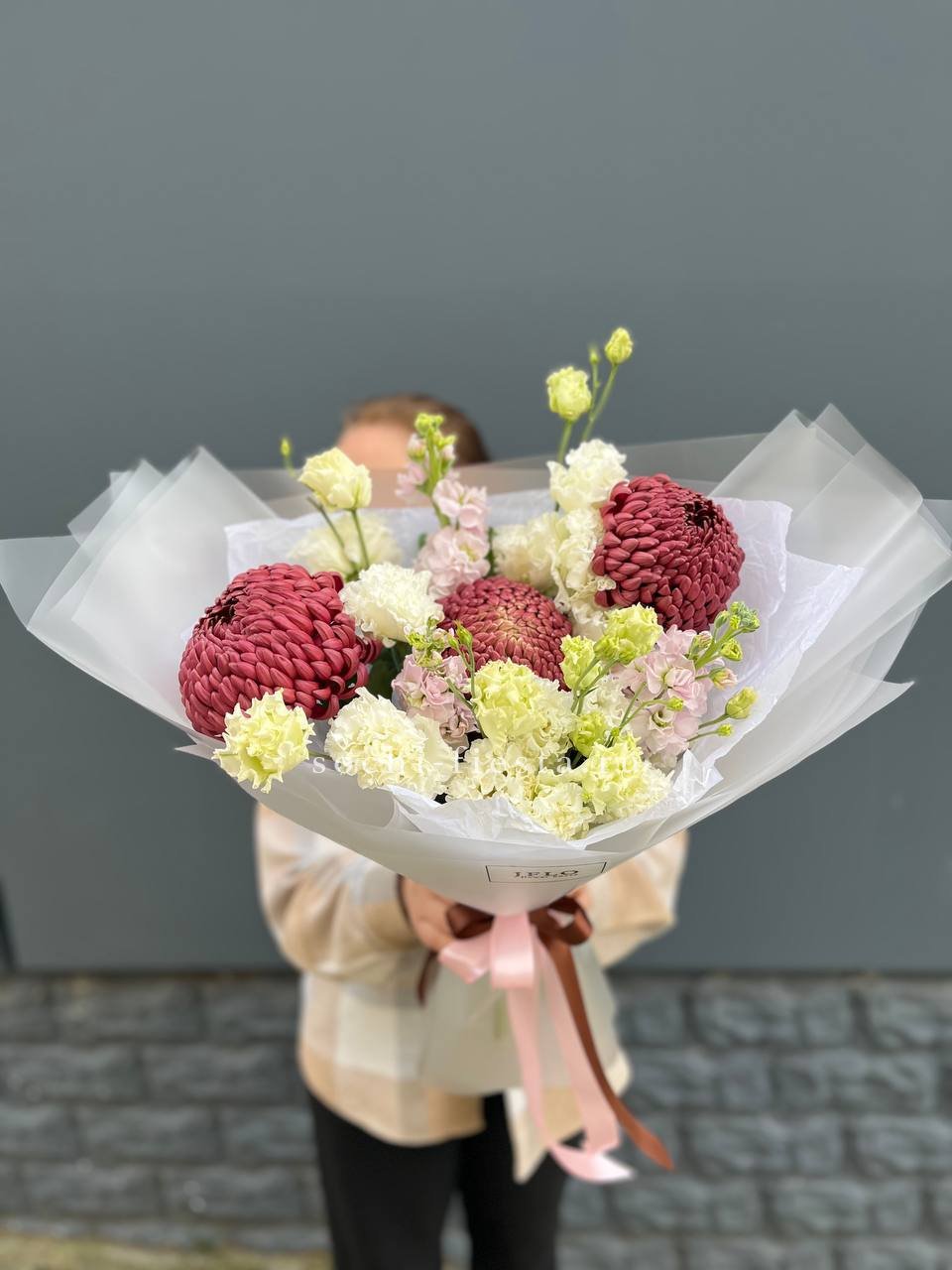 Маттиола наполняет букет весенним ароматом и текстурой вытянутых соцветий. Кудрявая хризантемия Бигуди и многослойная эустома создают объём и лёгкость, которая освежает пространство.