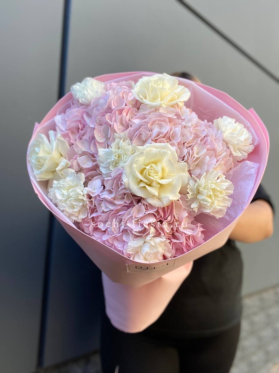 гортензия, эустома, диантус, мисти баблс, озотамус в нежном оформлении.