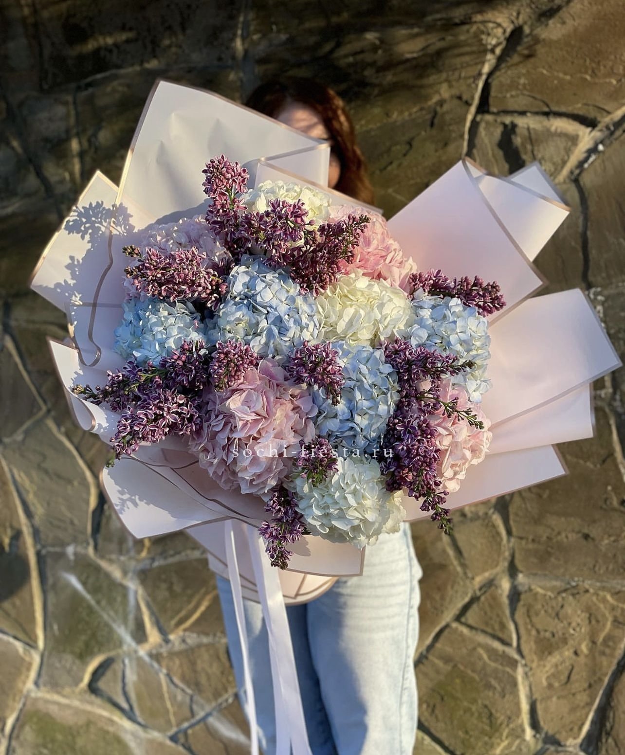 гортензии различных цветов, сирень, оформление, лента.