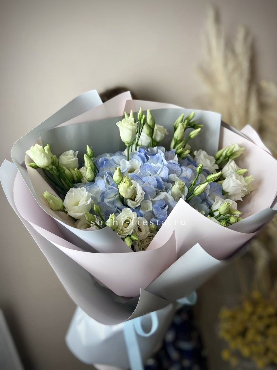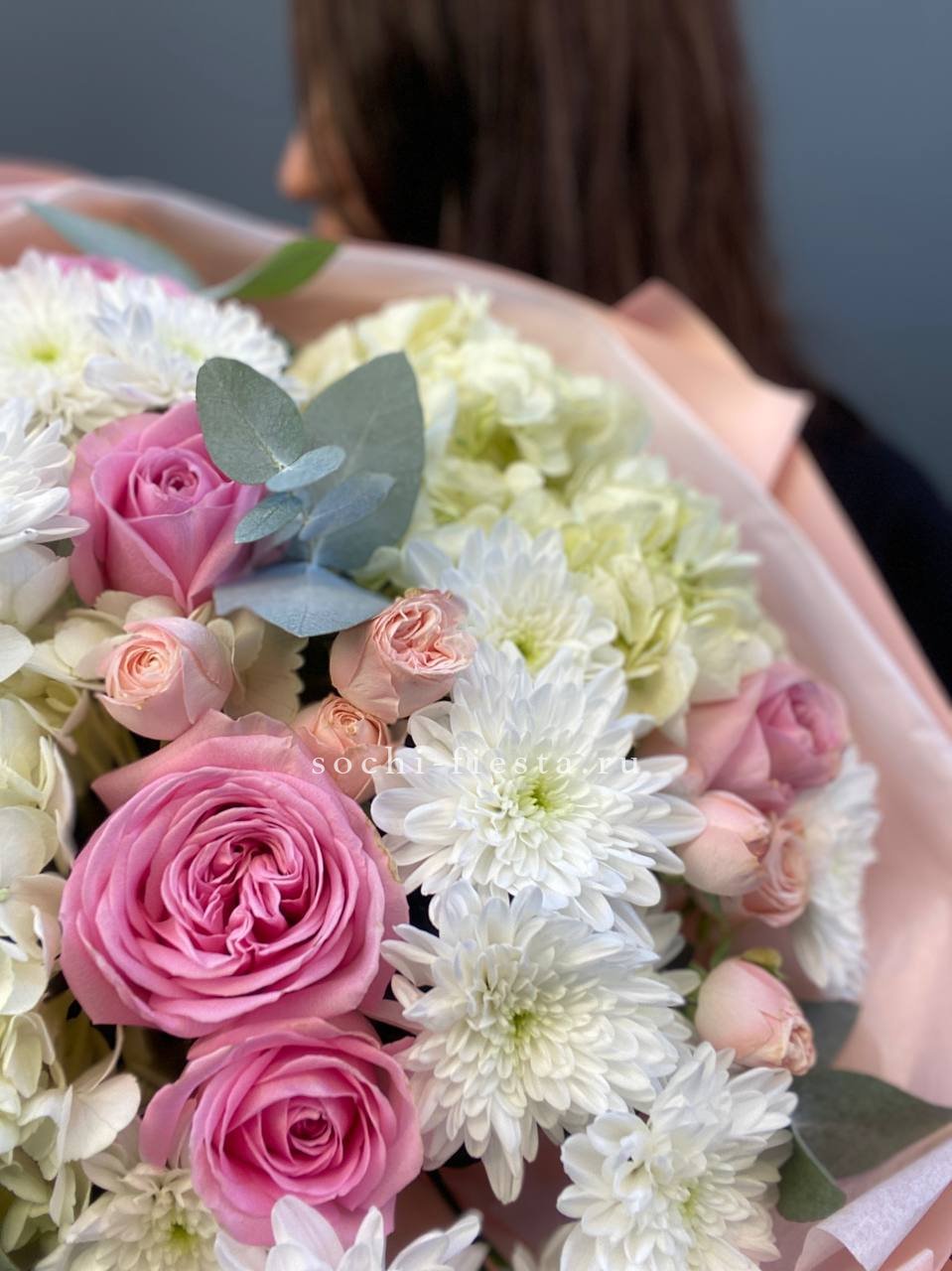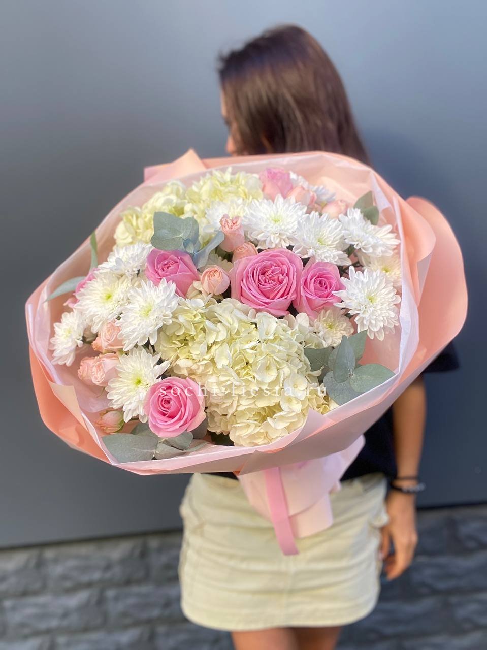 гортензия, хризантема, роза, эустома, упаковка, лента.