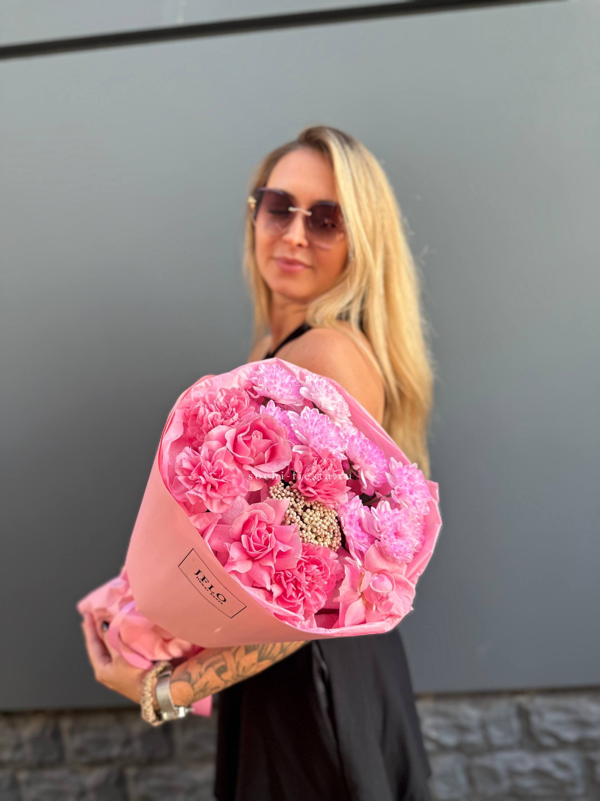 гортензия, диантус, хризантема, эустома, розы, озатамус, пленка.