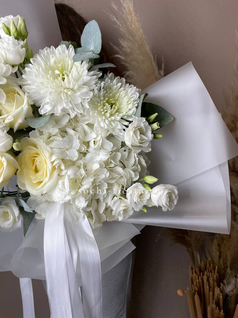 лотос, хризантема, диантус, хлопок, озатамус, пионовидная кустовая роза, эвкалипт, ковыль, оформление.