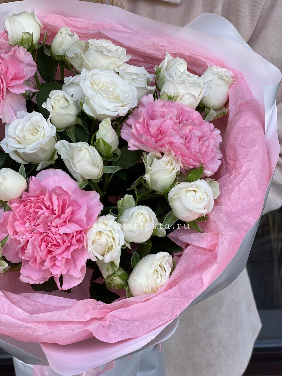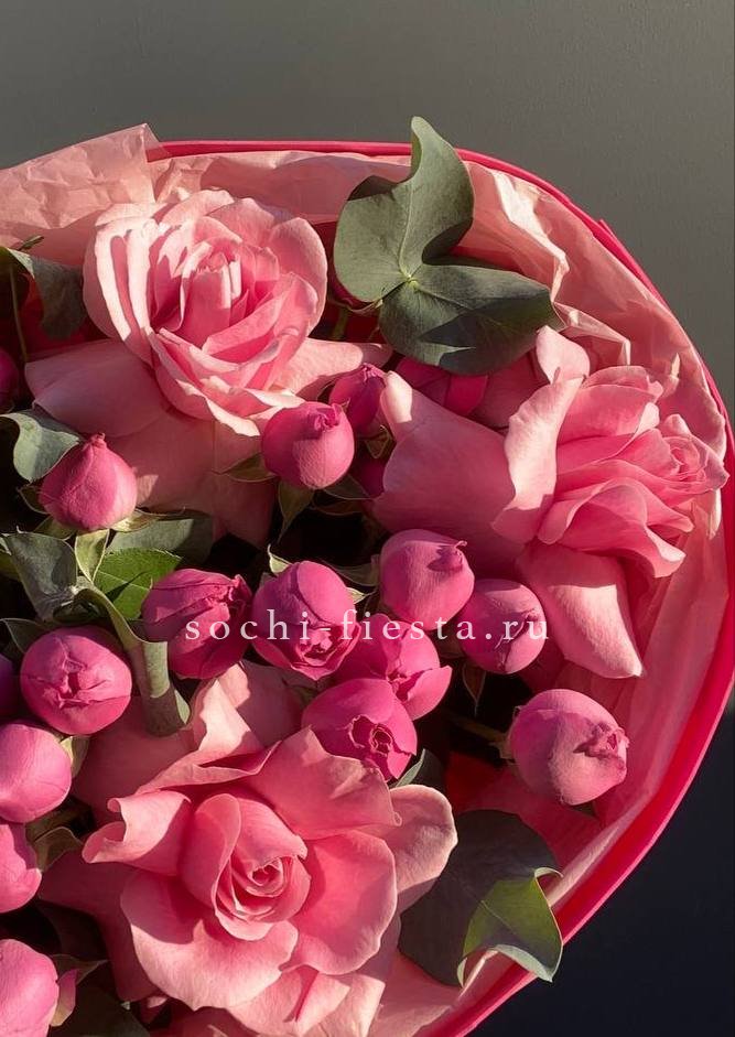 диантус, розы, бомбастик, эвкалипт, упаковка.