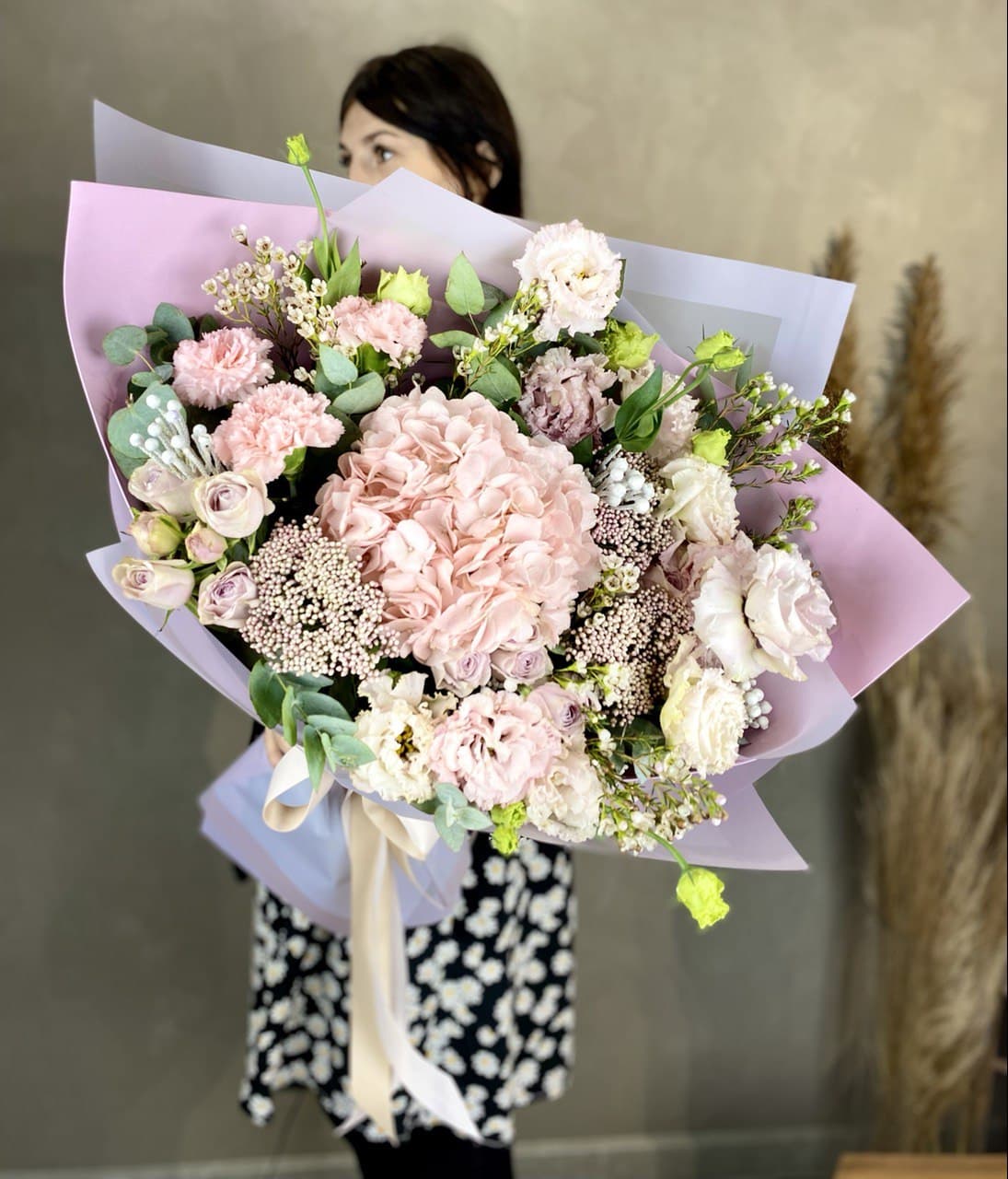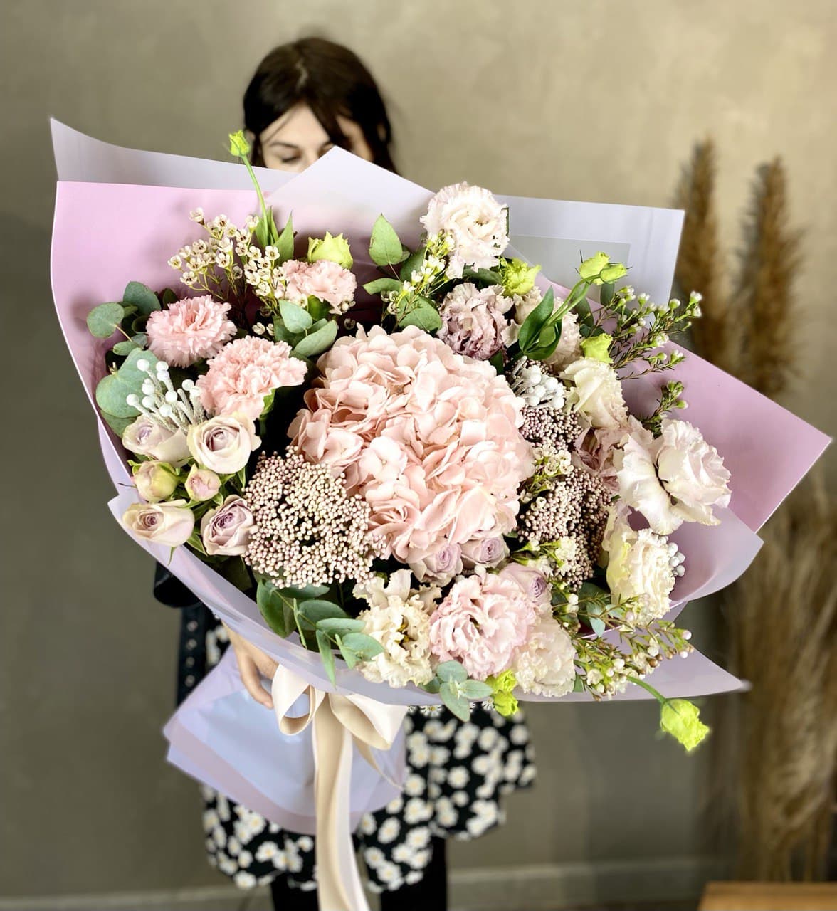 Пышные розы и бомбастик образуют округлую форму с мягкими переходами. Диантус заполняет промежутки между крупными бутонами, а эвкалипт добавляет воздушности композиции.
