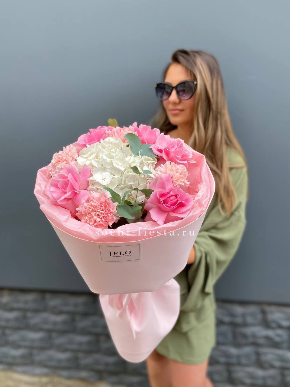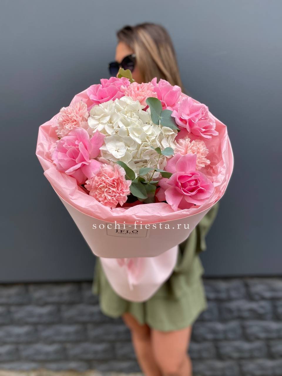Воздушная композиция с крупными соцветиями гортензии и пышными розами создает ощущение легкости и объема. Эвкалипт добавляет свежести, а бомбастик расставляет яркие акценты между бутонами.