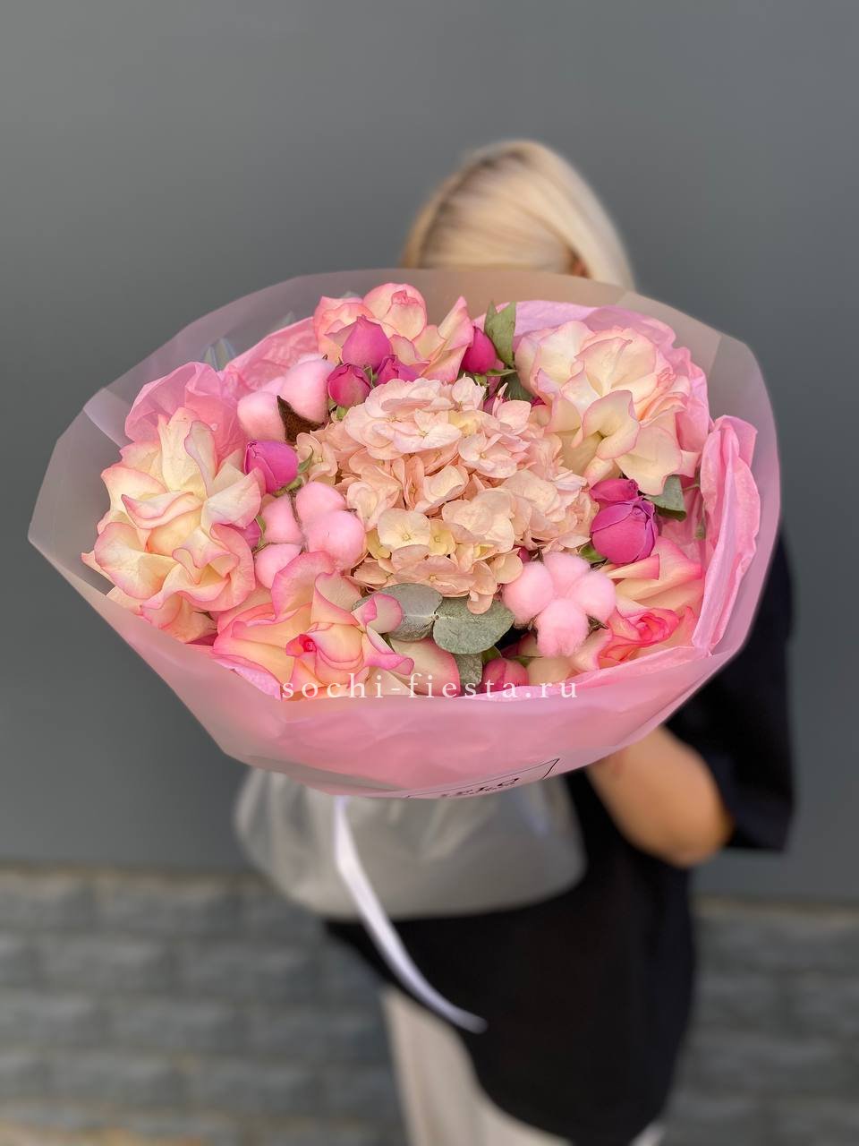 хризантема кустовая, гортензия, мисти баблс, розы в нежном оформлении.