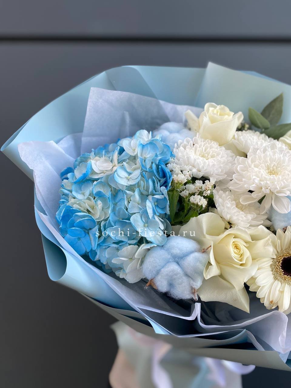 диантус, эустома, гортензия, хайди, эвкалипт, озатамус, пленка.