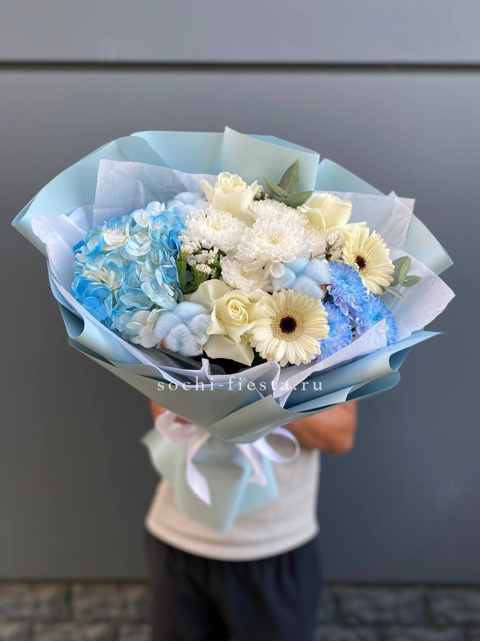 Плотная сборка с пышной гортензией в центре и рассыпчатыми соцветиями диантуса по краям. Эустома добавляет воздушности, а ветки озатамуса создают лёгкую графику. Букет держит форму и выглядит объёмно с любого ракурса.