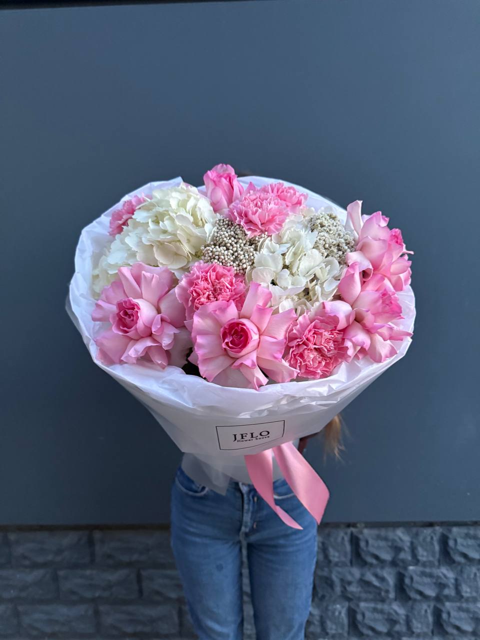Мягкие пионовидные формы переплетаются с классическими розовыми бутонами в плотной округлой композиции. Эвкалипт освежает палитру и придаёт букету завершённость.