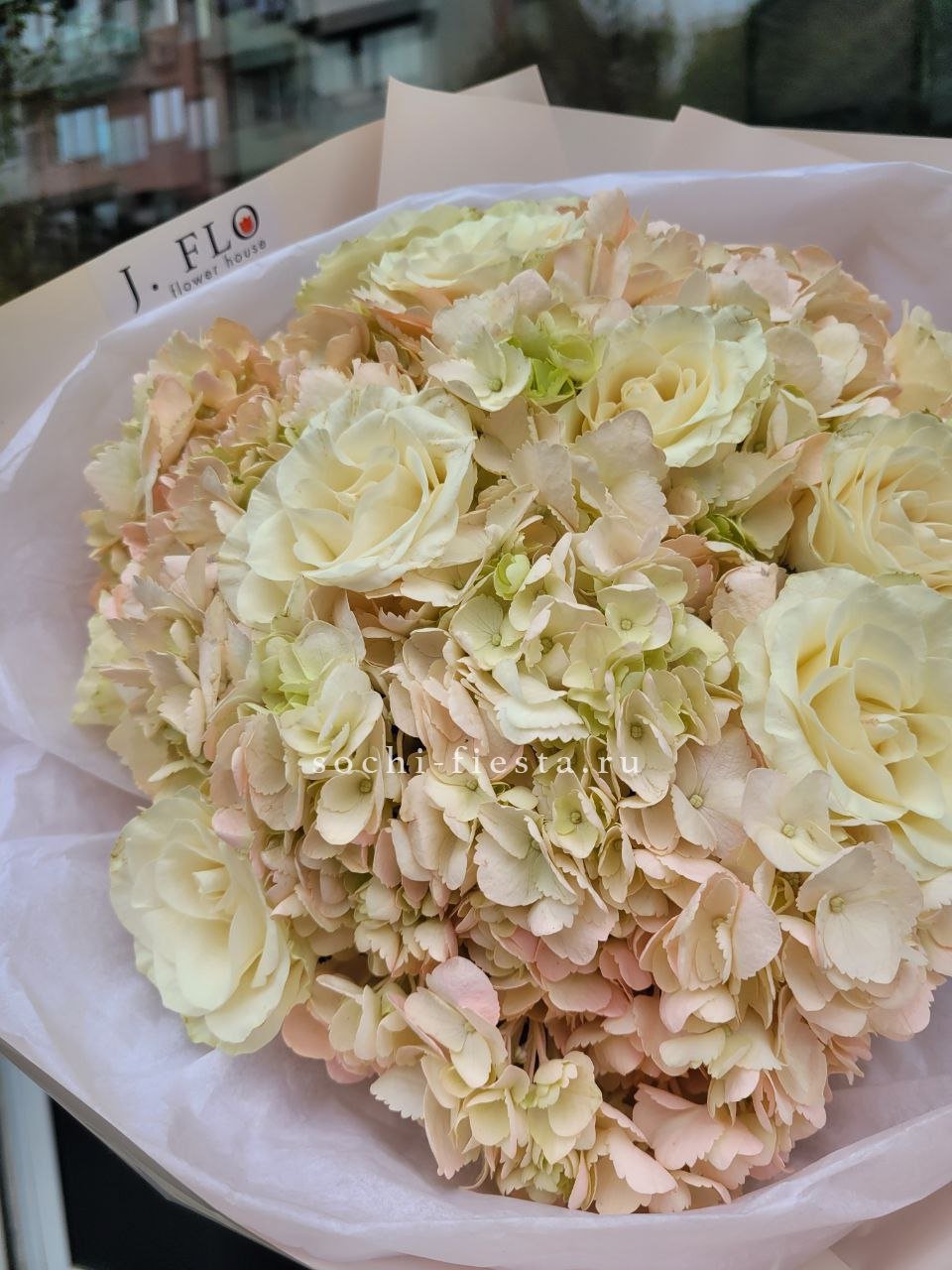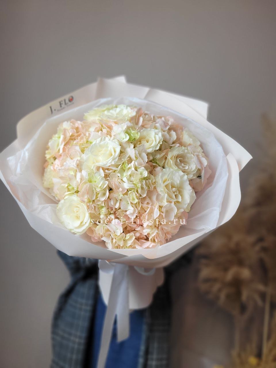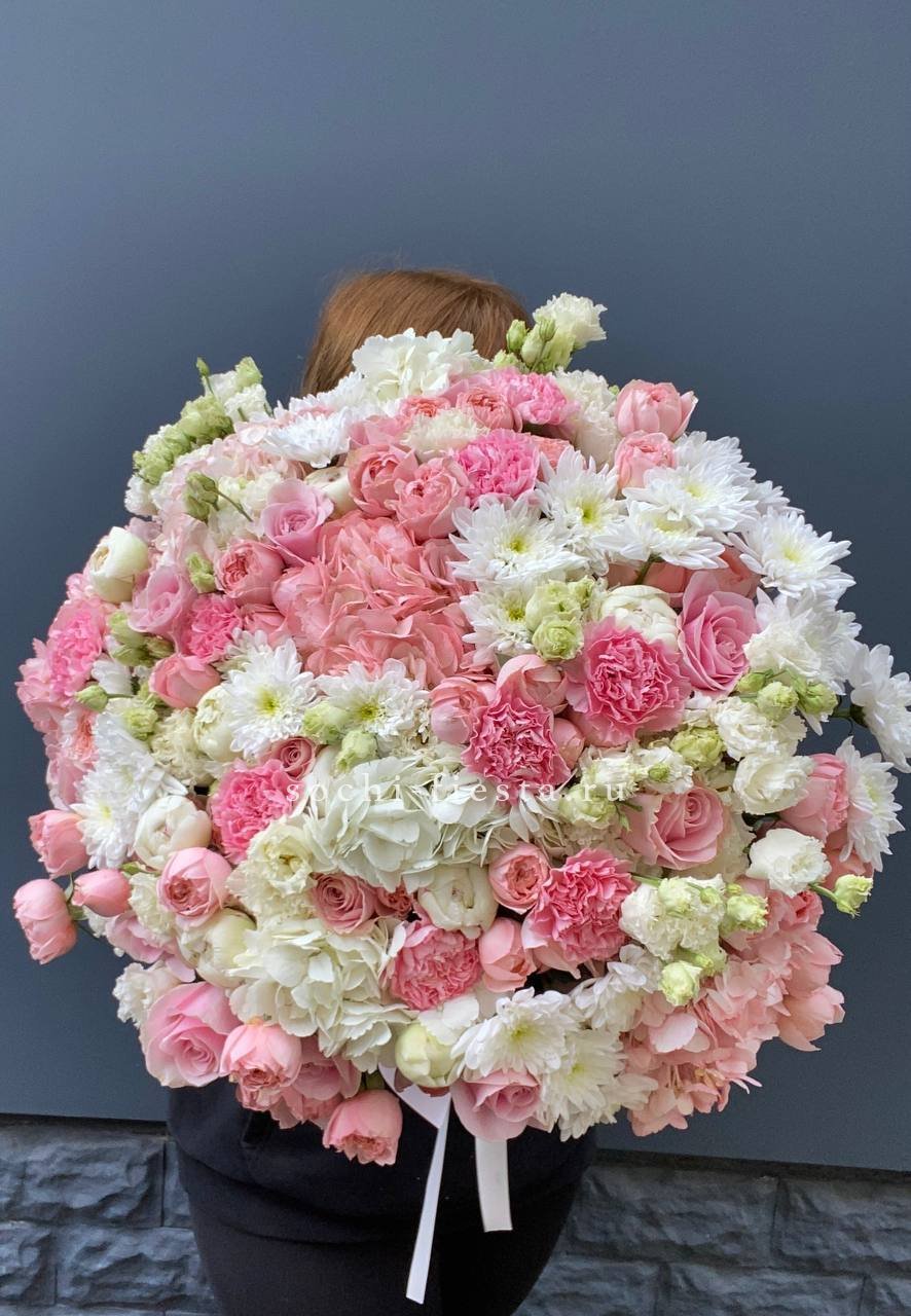 Масштабная композиция с пионами, эустомой и розами разворачивается во всей красе. Хризантемы и гортензия создают впечатляющее присутствие, которое преображает пространство вокруг.
