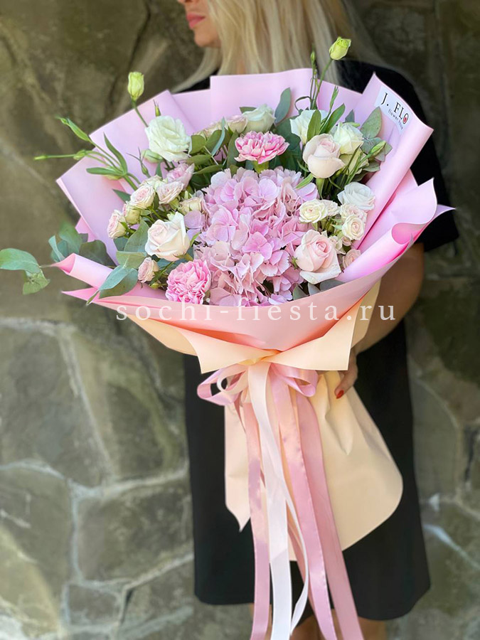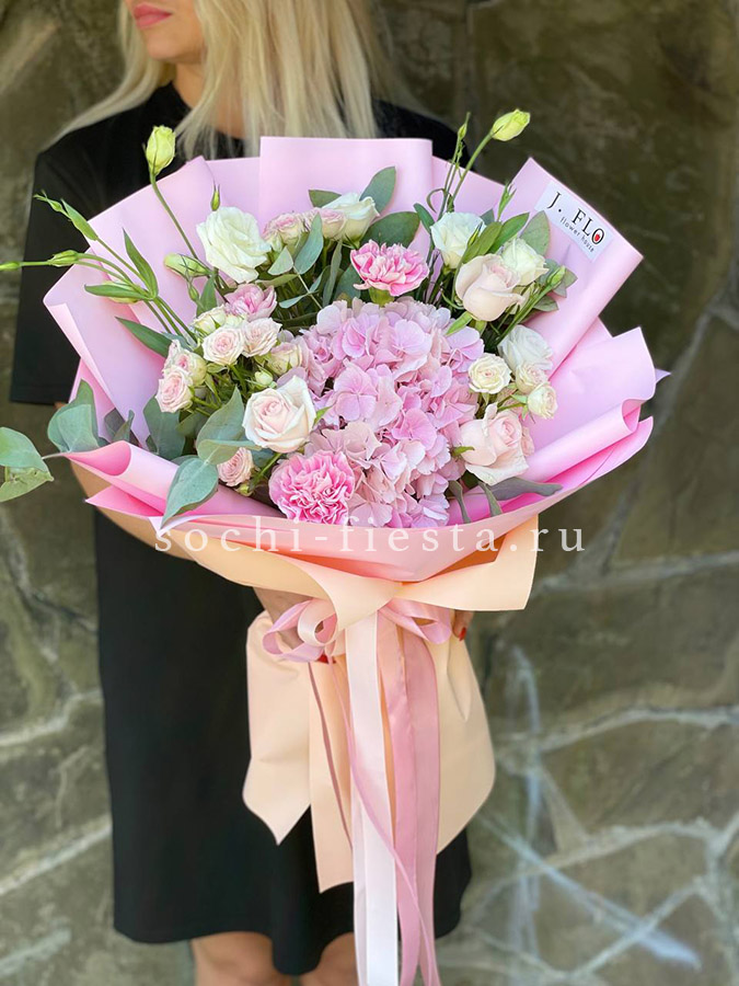 хризантема, гортензия, розовая роза, эустома, пионы ( может меняться, в зависимости от сезона), бомбастик, диантус, лента.