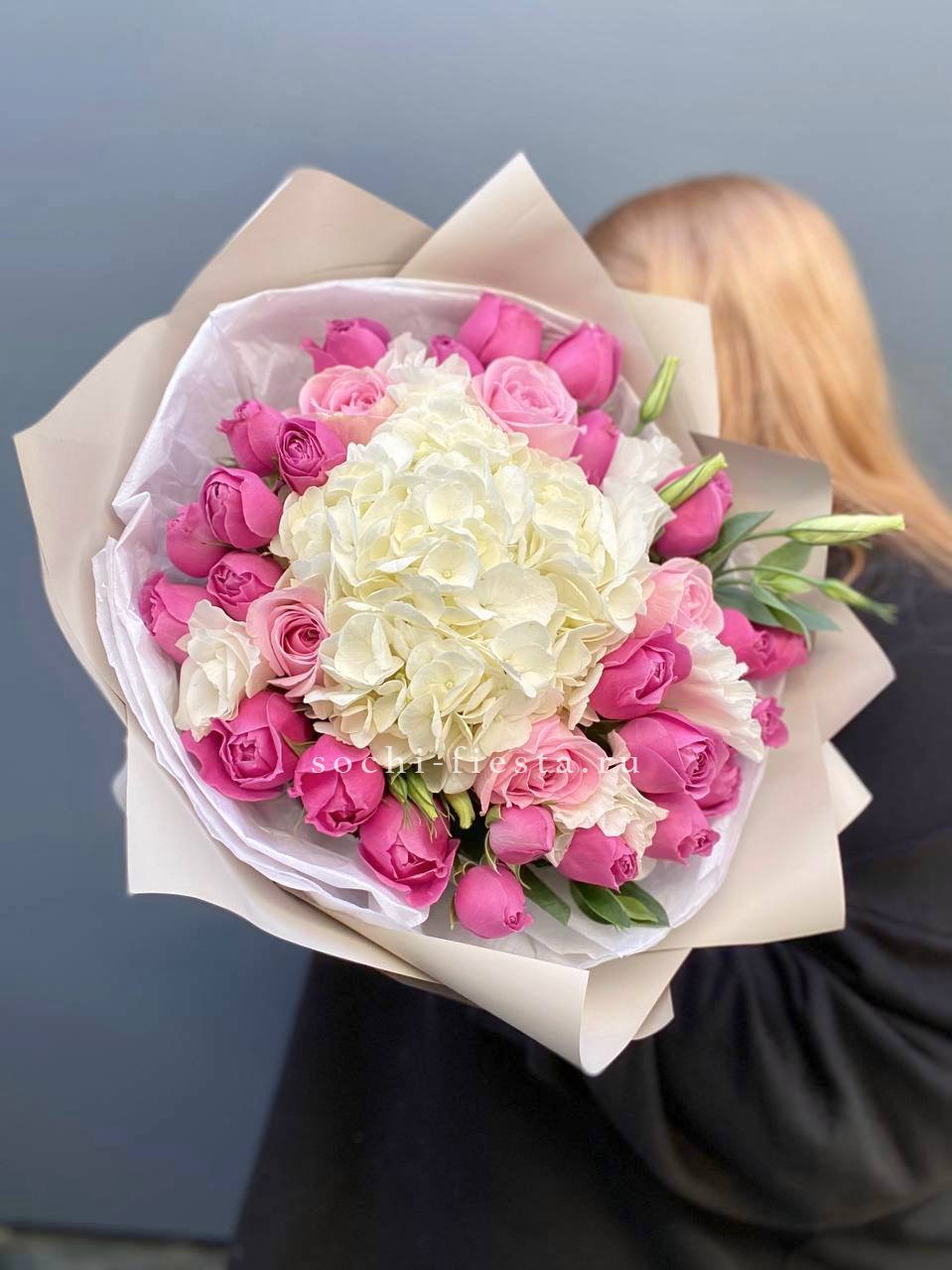 Воздушная гипсофила и струящийся амарантус создают движение вокруг крупных соцветий гортензии и роз Джумилия. Композиция построена на игре объемов и лёгкости линий.