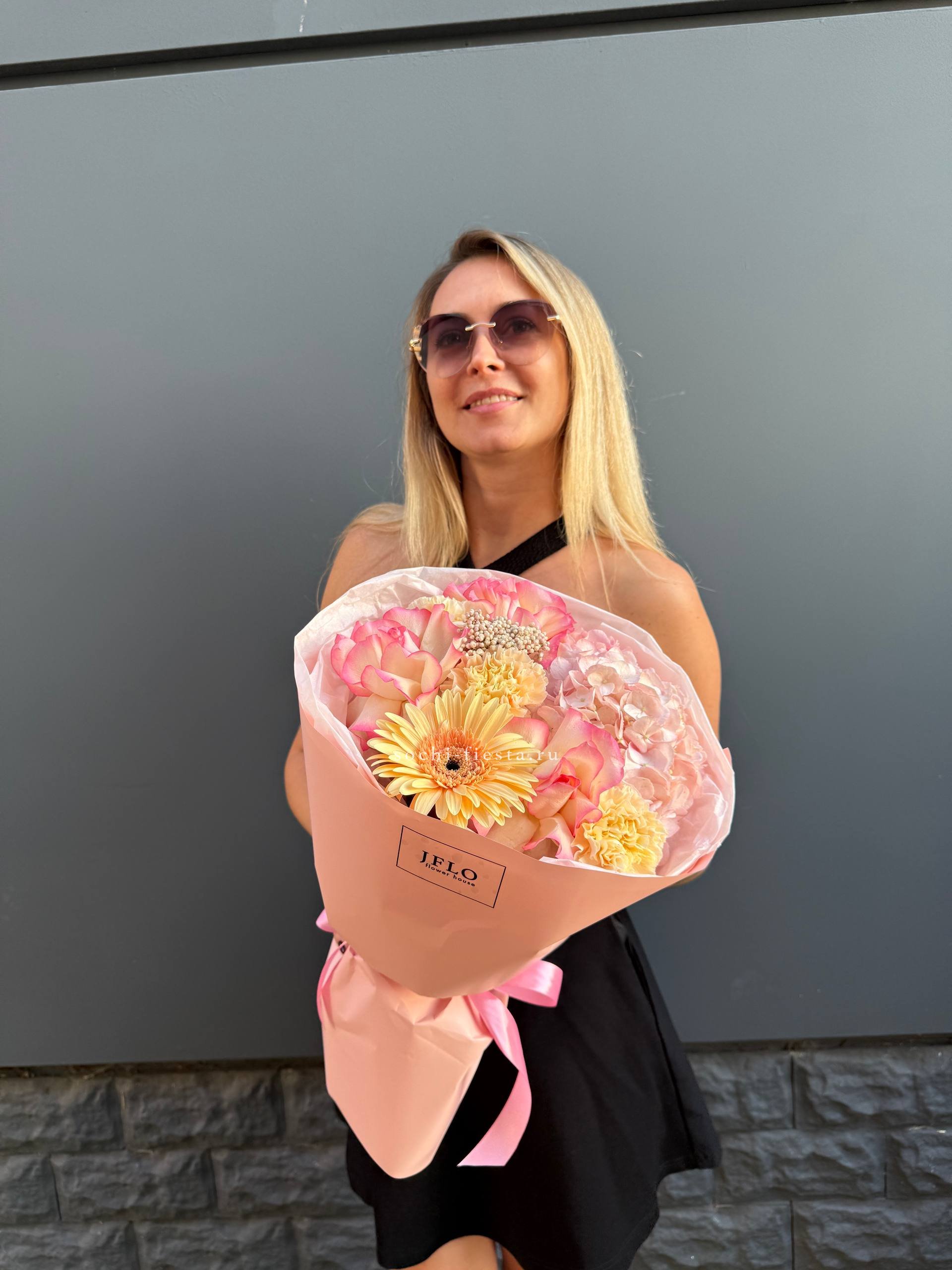 Пышная шапка из роз двух оттенков с объёмной гортензией и воздушным диантусом создаёт мягкий переход от белого к розовому. Бомбастик добавляет букету плотности, а эвкалипт освежает общую композицию. Универсальное решение для яркого поздравления.
