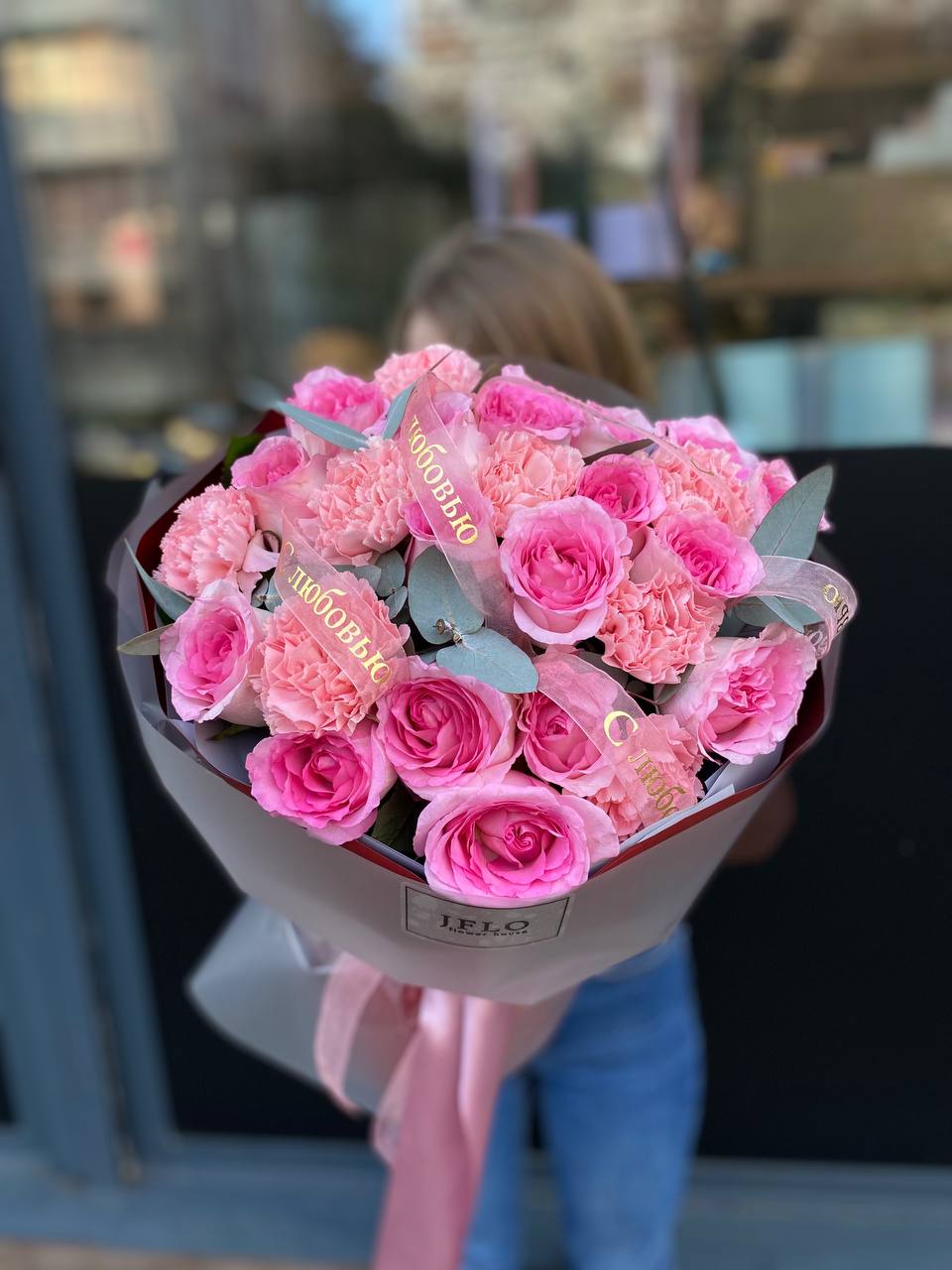 розы одноголовые, пион (или диантус), маттиола, эвкалипт, декоративная зелень, лента, дизайнерская пленка.